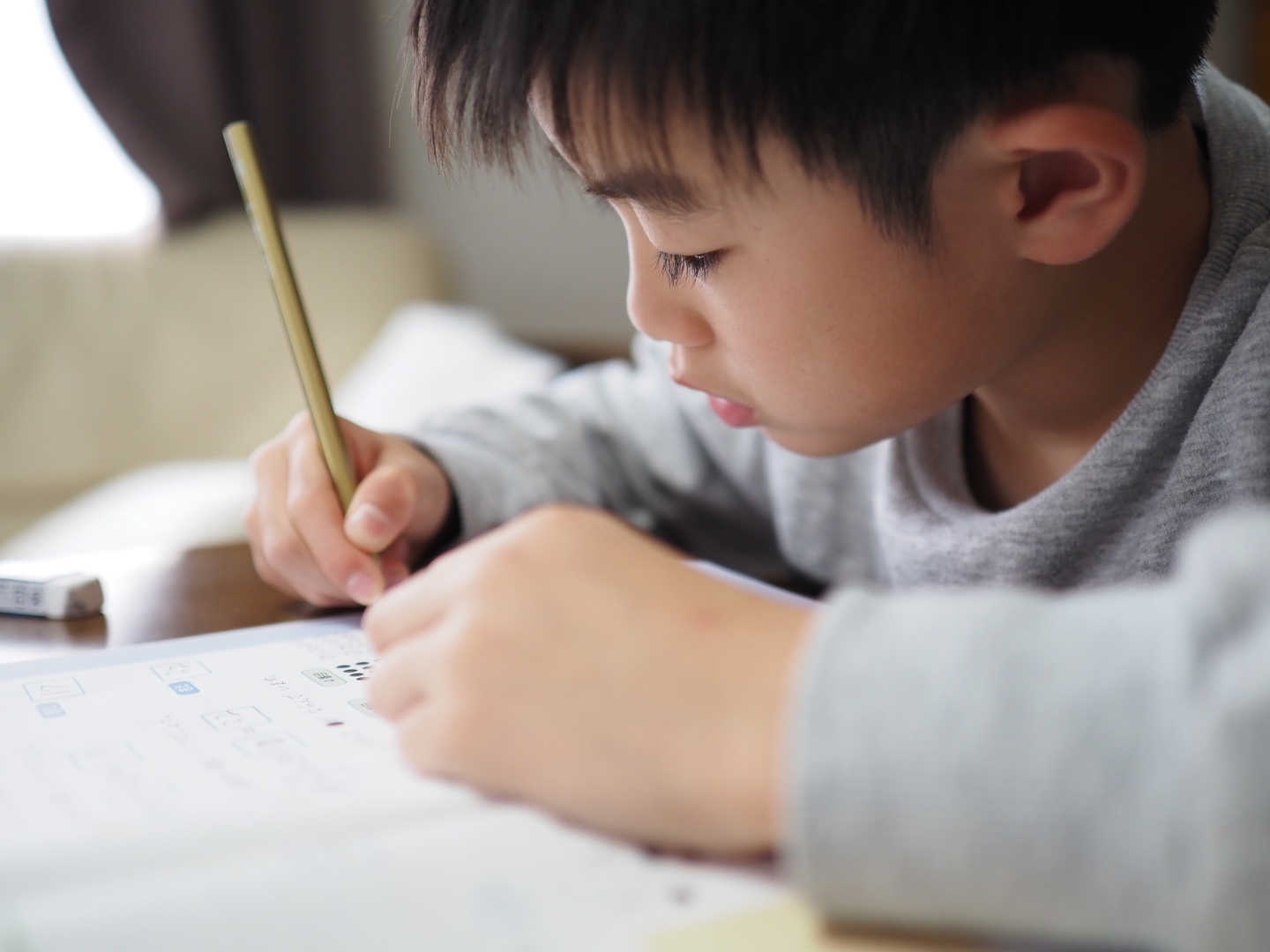 テレビゲームの許可を得るために宿題をがんばる小学2年生を隣で撮影。周囲の余計なものを写し込まない画角と、ピントの前後をきれいにボカしてくれるこのレンズはおうち撮影にもピッタリです。カメラ側で静音シャッターの設定にすることで、勉強の邪魔をすることなく撮影ができました。