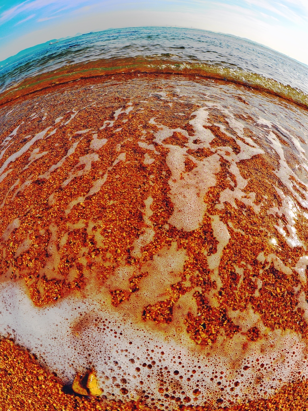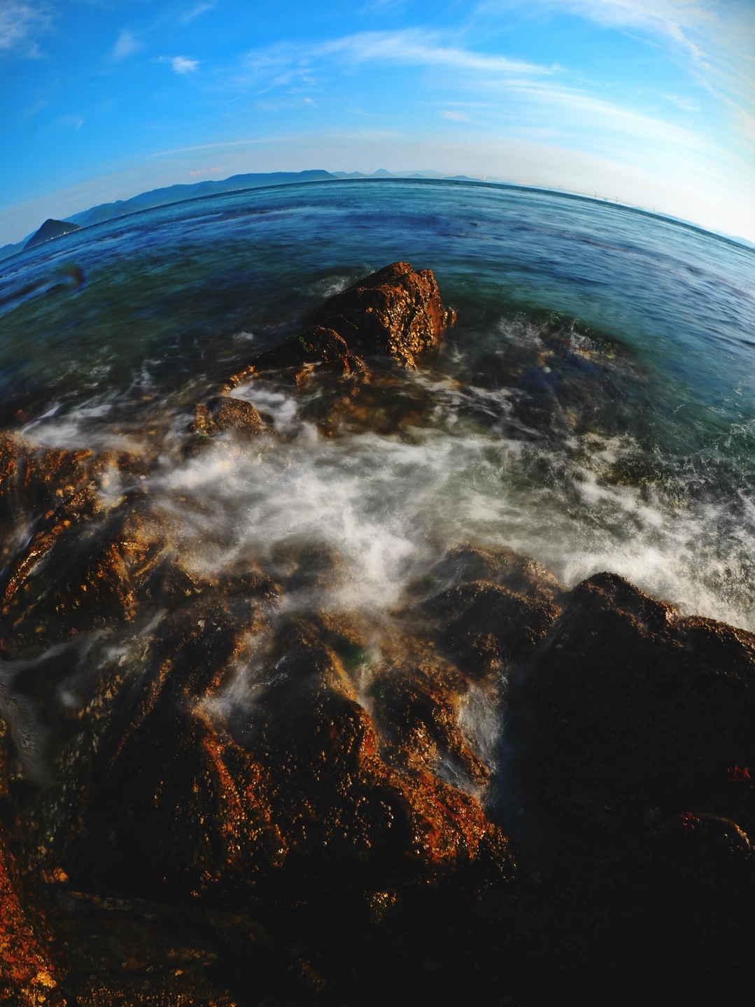 カメラを下に向けて写すと上部がアーチ状に大きく歪む。フィッシュアイレンズのレンズ効果を使って水平線を曲げて写すと丸い地球の感じが表現できる。そしてOM-DシリーズのE-M1XとE-M1 Mark IIIには、ライブNDというデジタル処理でND効果を得る機能が搭載されているので、物理的にフィルターがつけられないフィッシュアイレンズでも日中のスローシャッターを切ることができる。ライブND機能のおかげでフィッシュアイのレンズ効果を生かしつつ波を抽象化した表現が可能となった。