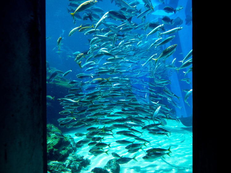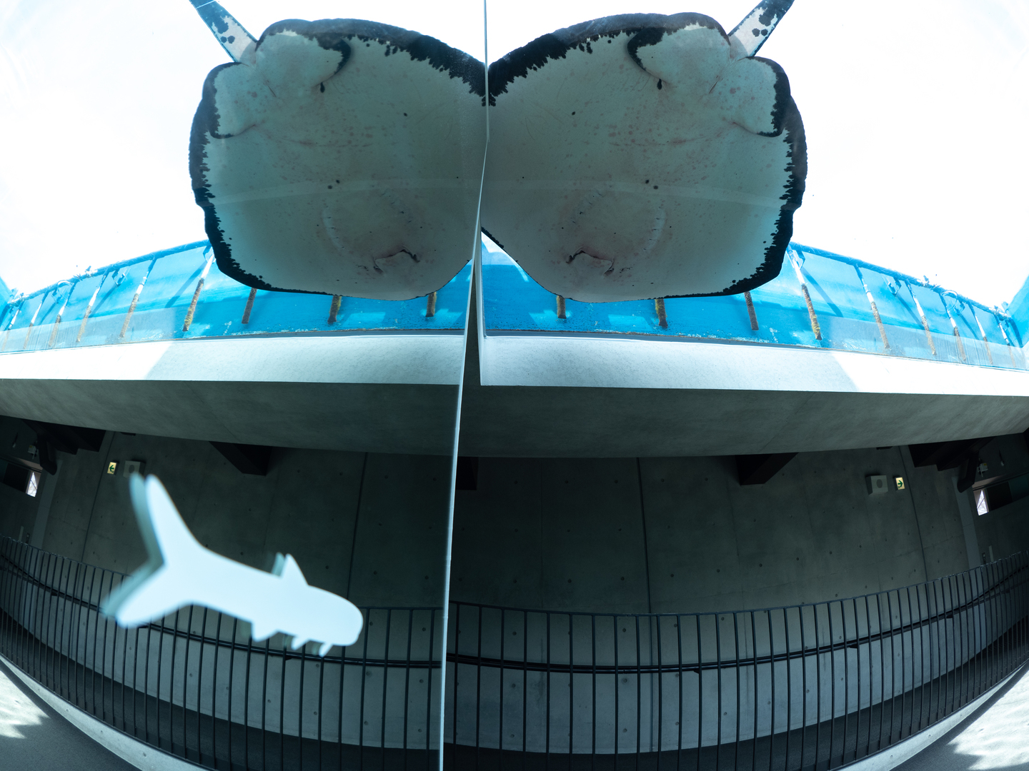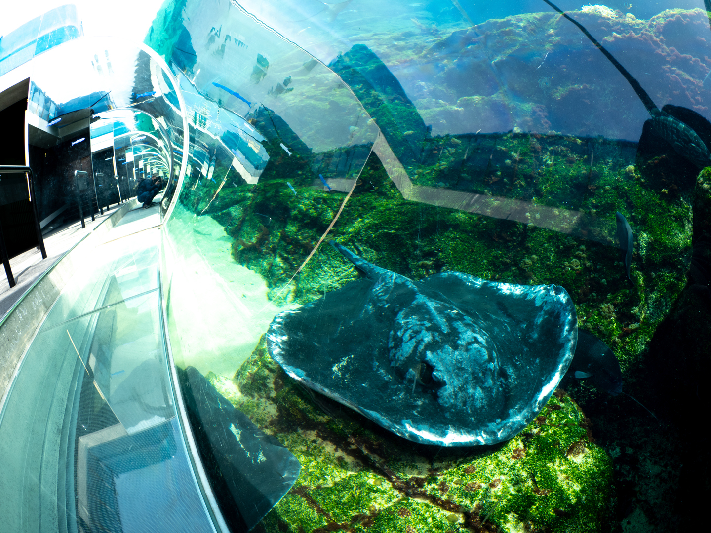 ガラス張りの水族館内部には至る所に反射物があります。それらを利用するとちょっとユニークな表現にできます。この写真、笑っている顔に見えませんか(笑)。