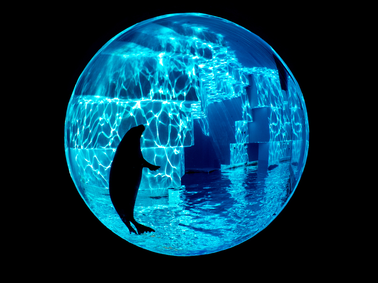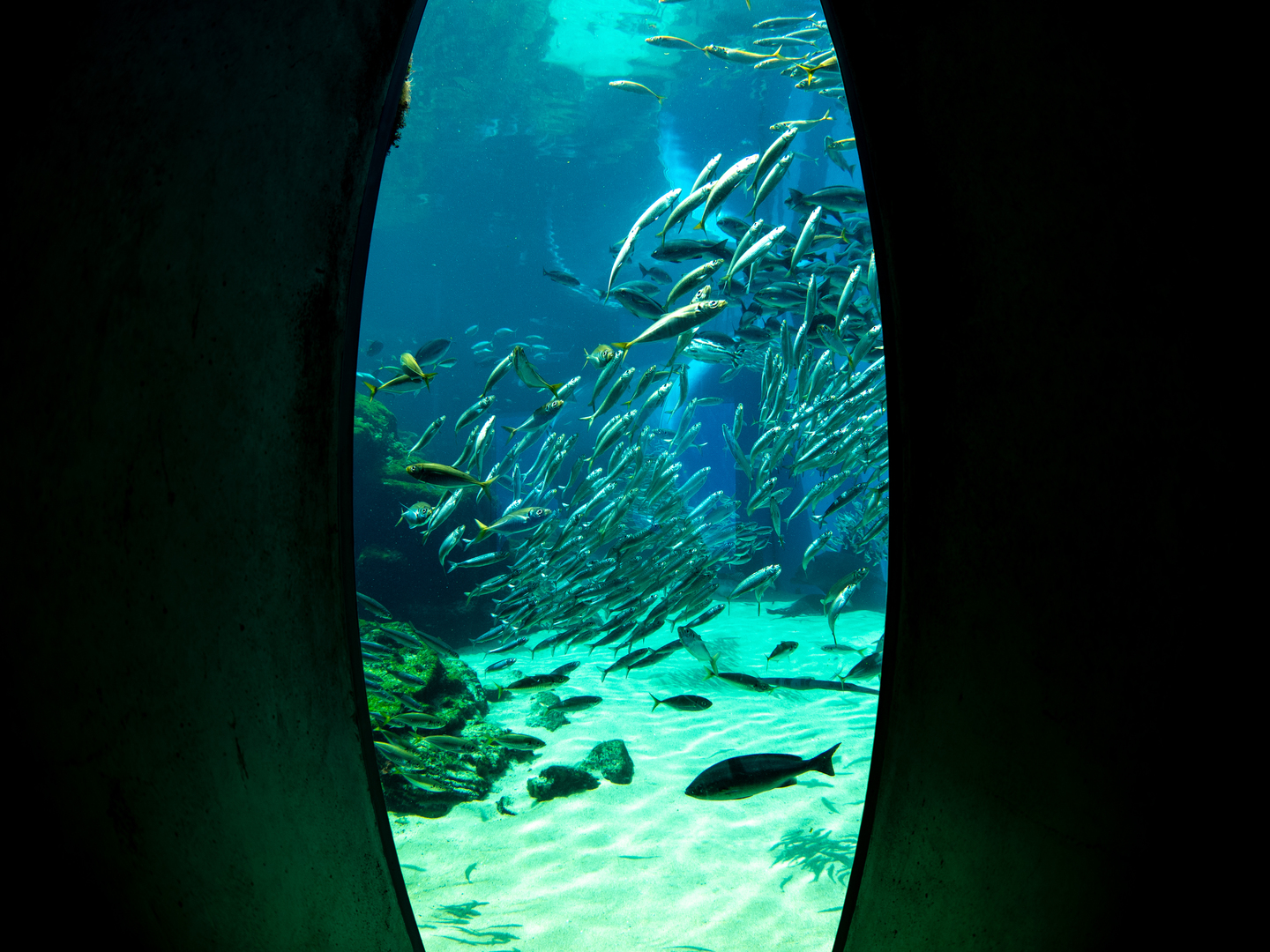 丸い形をした水槽がここの水族館にもあり、広く撮影すると魚眼レンズを使用しているかのようなユニークな写真が撮れます。ここではアシカのシルエットを利用してまるで絵画のような表現が出来ました!