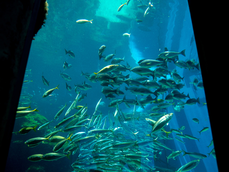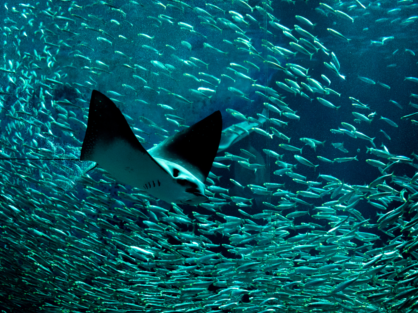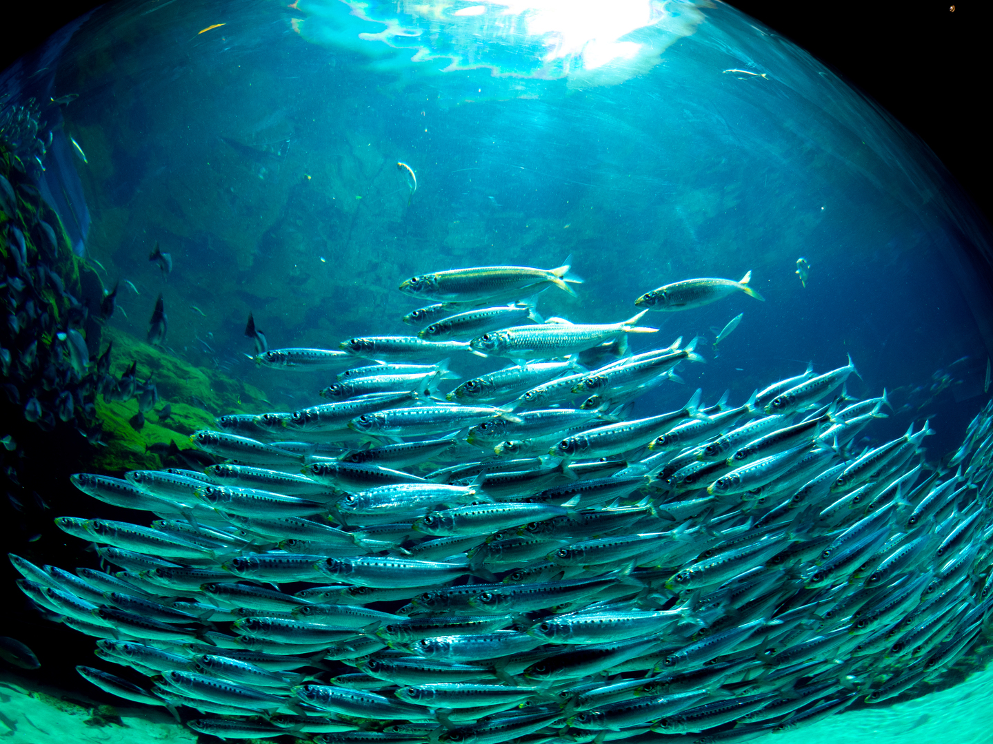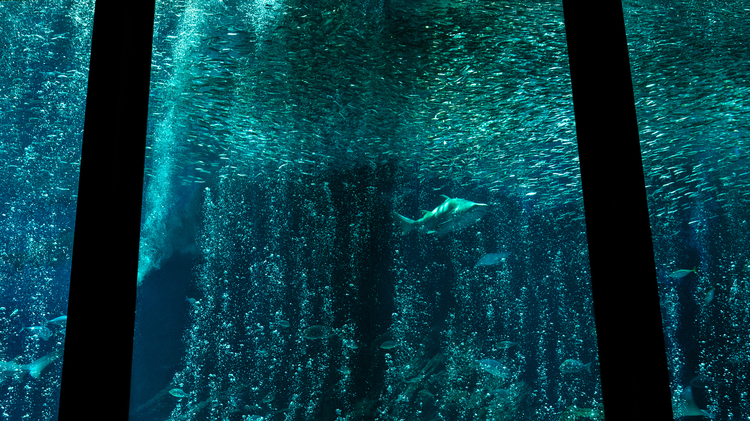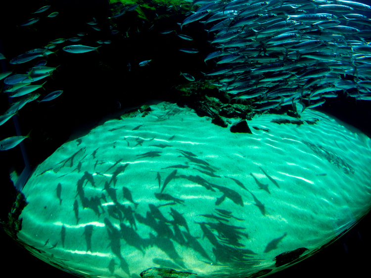 こちらは焦点距離8mmの魚眼レンズを使用して、カメラを上向きにし、魚眼効果と太陽を入れた作品です。この水族館はいい感じに自然光を取り入れていましたね。