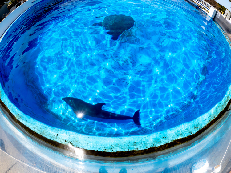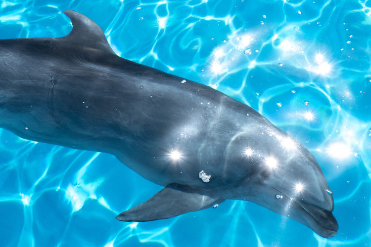 円形型のプールで泳ぐイルカ。魚眼レンズを使用して円形プールの輪郭をより強調しました。太陽の光条をアクセントにしています。