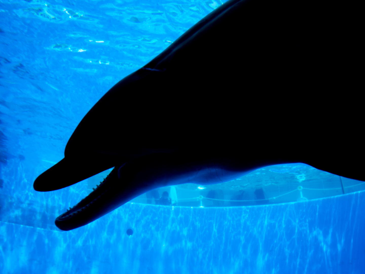水族館でイルカは定番の被写体ですね。この写真はあえてシルエットで顔の表情が判る部分を強調して作画しました。