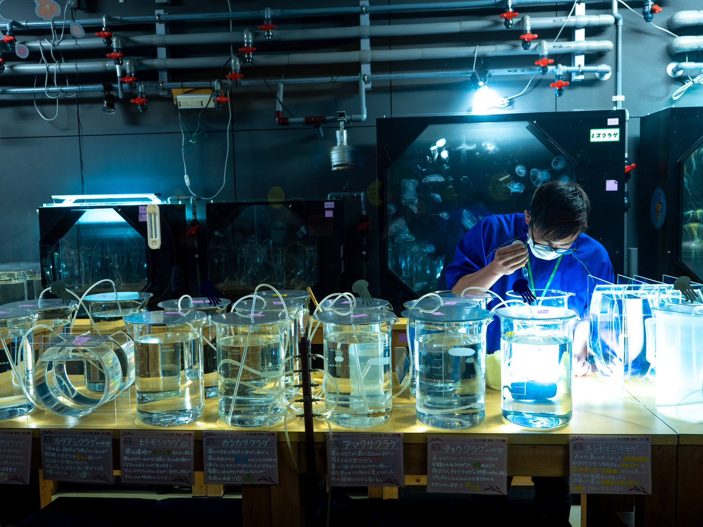 さて、いよいよクラゲゾーンへ。クラゲ研究室では真剣な表情で飼育されている様子が伺えました。