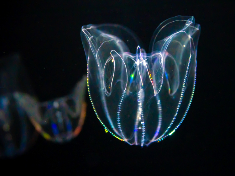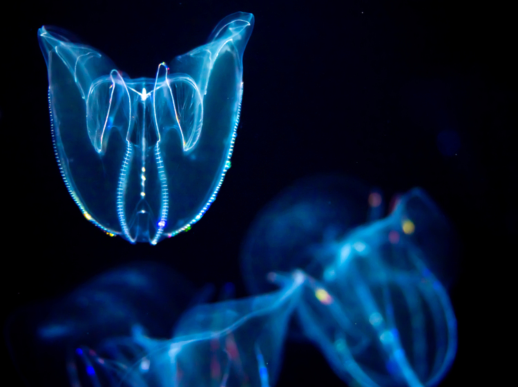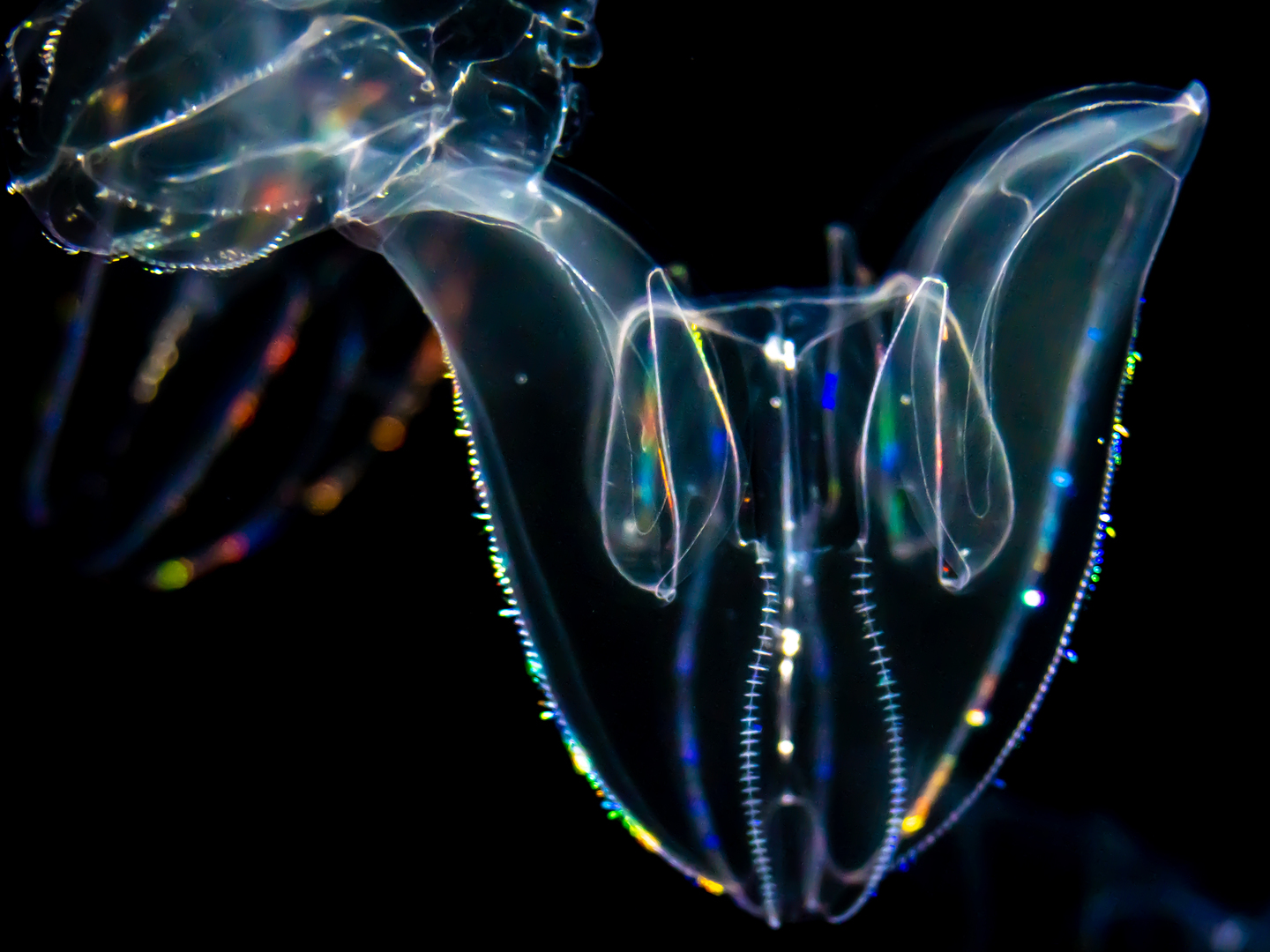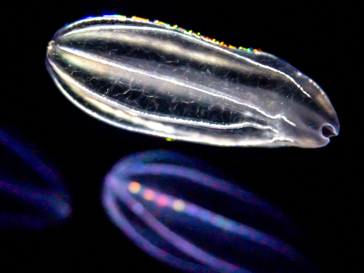 日本近海で比較的良く見られるウリクラゲ。しかしながら、実際の海では夜に見ないとこの様に奇麗なレインボーフラッシュはなかなか見られません。