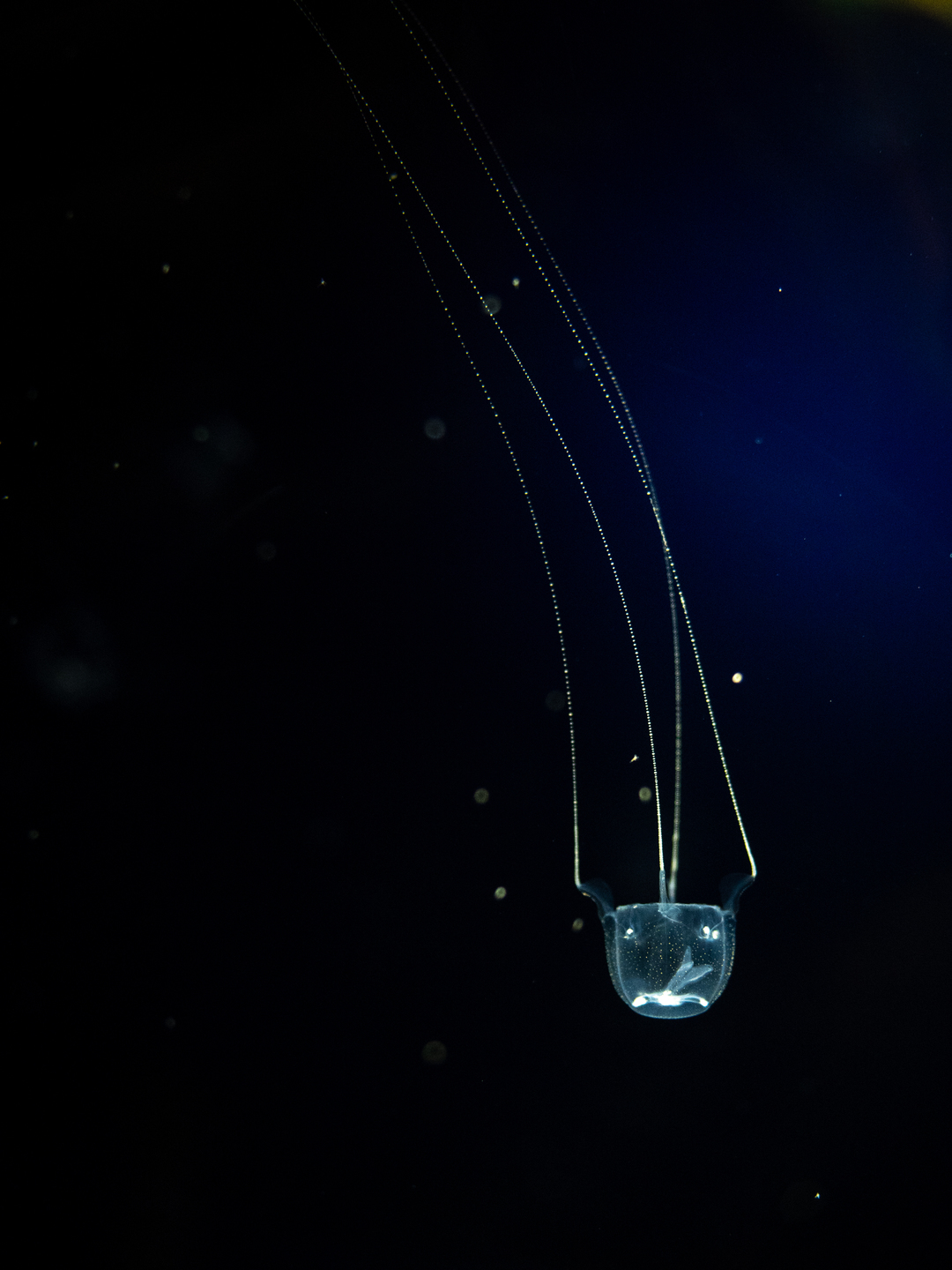 前ボケを生かしたカブトクラゲのこの作品は、前ボケの黄色い玉ボケをいかに取り入れるかがポイントです。今までは主役となる暗い被写体にピントを合わせること自体、非常に難しかったのですが結構簡単に撮影出来たことで「すごい技術の進歩だな…」と感じました。と、同時にこのカメラでないと撮影できない表現も多々あることを感じさせてくれました。