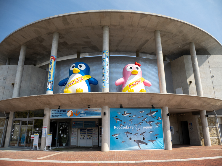 次に訪れたのは全国的にも珍しいペンギン専門の水族館、その名も「長崎ペンギン水族館」です。近代的な建物に青とピンクのペンギンがお出迎えしてくれました。