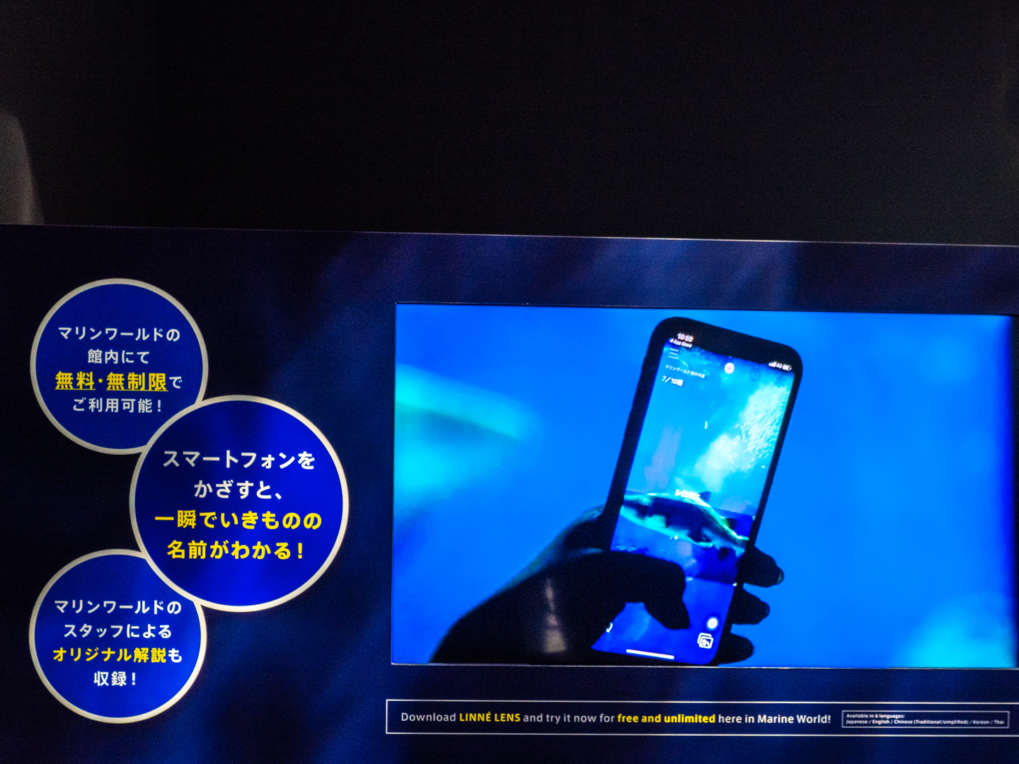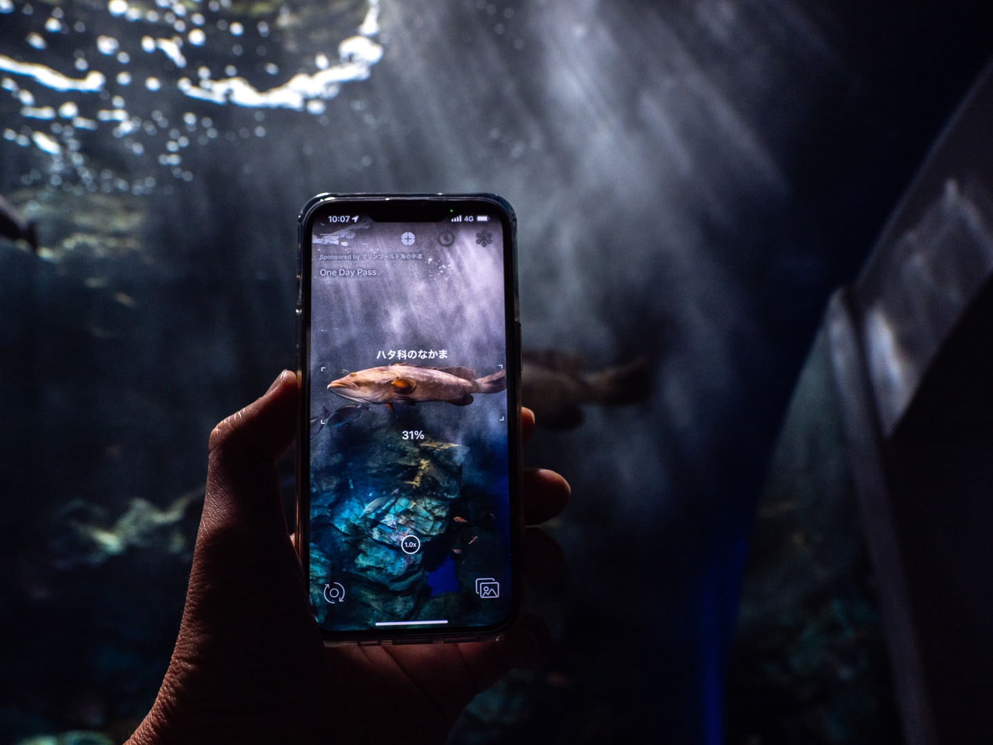 入口では便利なスマホアプリの紹介があり、早速入れてみると非常に便利なアプリでした!ここの水族館内では無料で使えたので是非入れてみることをお勧めします。こんな風に魚に向けると魚の名前が瞬時に判明します。そして、魚にタップすると詳しい説明も出るんです。こちらもAI被写体認識の機能を使用しているようですね。