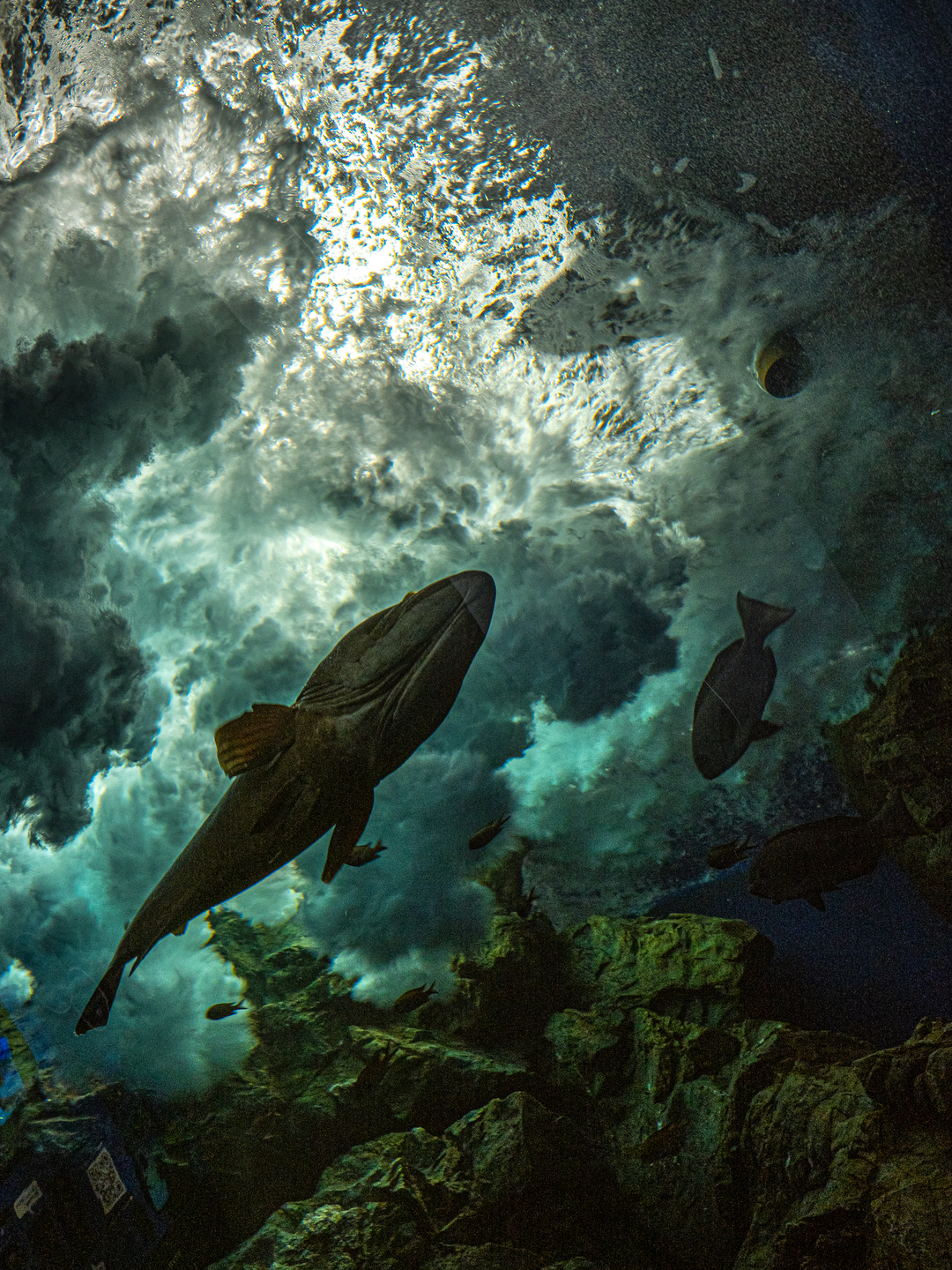 ここの水族館は魚の魅せ方がとても素晴らしいですね。この様に岩に砕け散る水中波の様子までも再現できています。大きなハタが良い位置に来るまで粘った甲斐がありました。ところで、現実の海でこのような波が打ち寄せる浅場の岩礁帯で撮影をするとなると、非常に危険ですからこのショットは安全な水族館だから撮れた写真です。