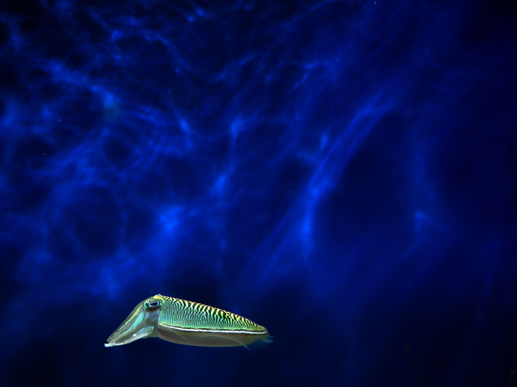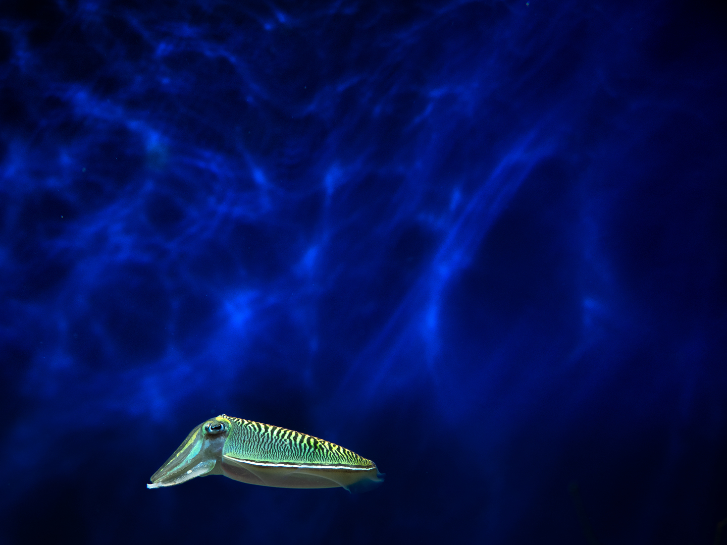 まるで宇宙船のように見える浮遊するコブシメ。AI被写体認識AFのおかげで構図を考える余裕が出来たので、右上の空間を大きく取り入れ、とても幻想的に表現出来ました。