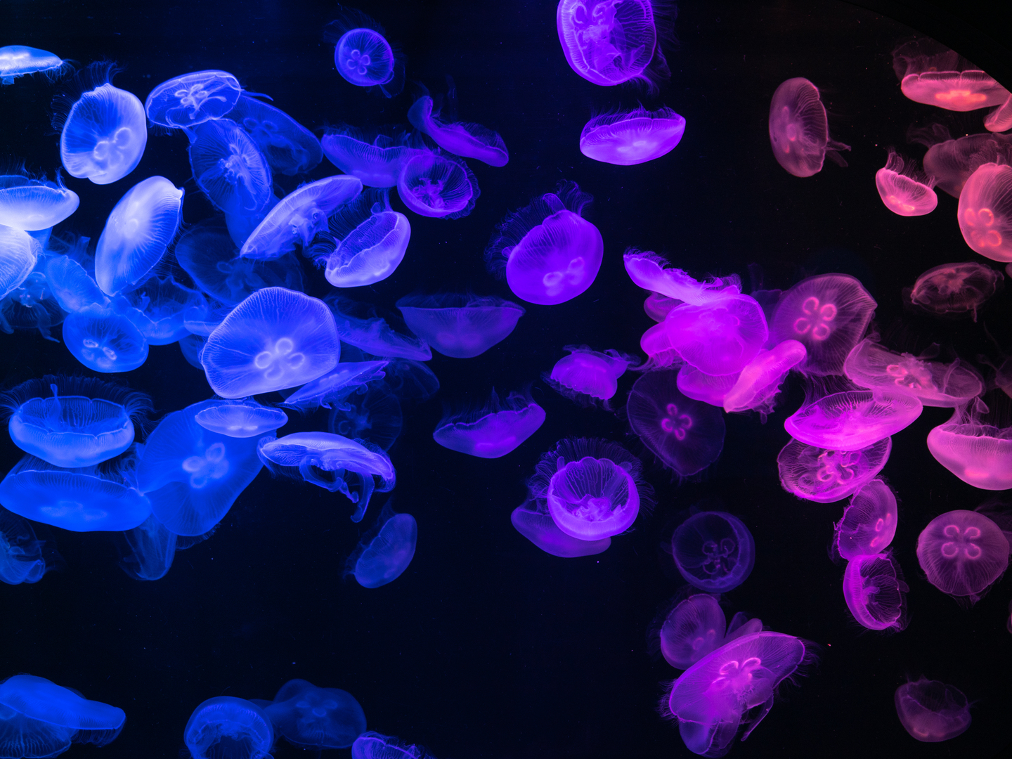 幻想的なカラーでライトアップされていたミズクラゲ。クラゲの配置がいい感じになる瞬間を狙いました。