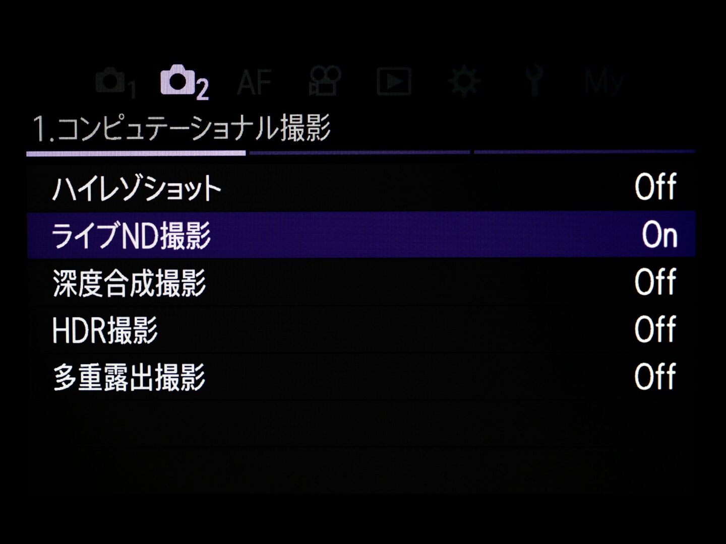 尚、このライブND機能はSモードまたはMモードで有効となり、それ以外のモードではメニュー画面で選択できないようになっていますのでご注意を。