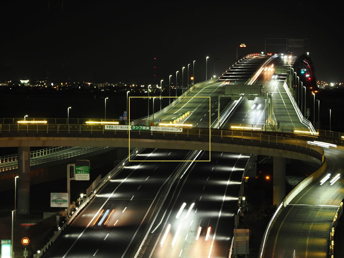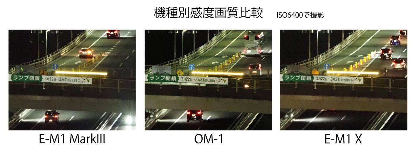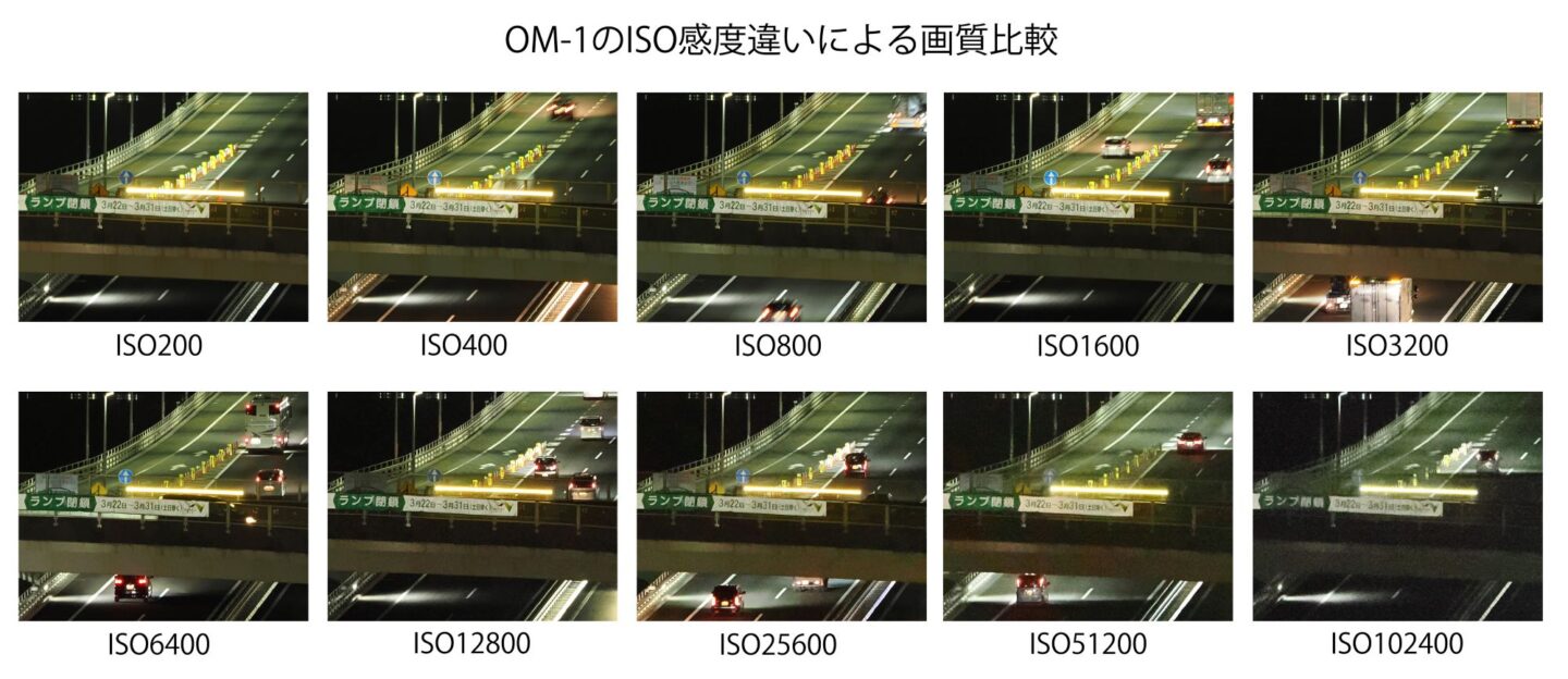 高速道路の橋梁をOM-1で夜間撮影。カメラぶれを防ぐ為にカメラは三脚に固定。シャッターボタンはリモートスイッチを使用して押している。ISO感度を基準感度の200から常用感度上限の25600まで、さらに拡張感度上限の102400まで1EV分ごとに変更し、撮影した画像の中央部を等倍で切り出し比較した。注目点は橋梁の暗部のノイズと掲げられた横断幕の文字や橋梁鉄骨部の精細さとする。基準としてISO200の画像と比較することで画質の違いを確認した。