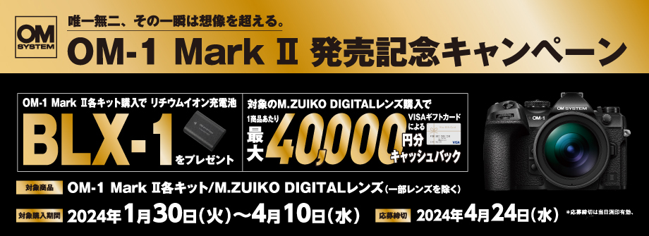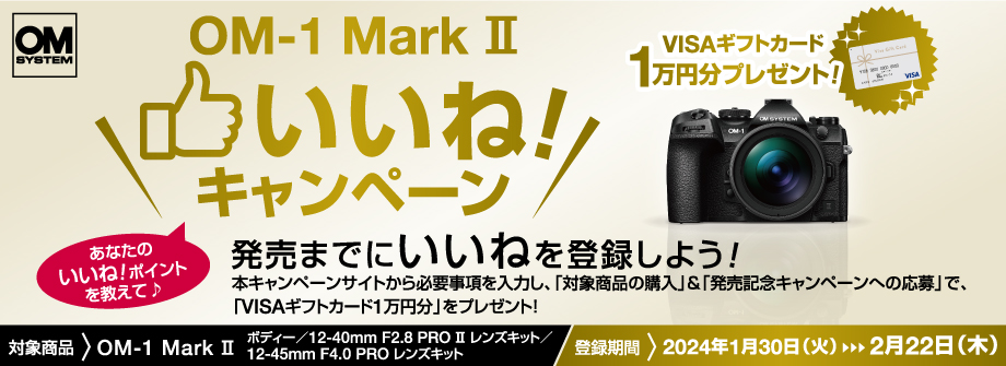 ■概要:登録期間内に「OM-1 Mark II いいね!キャンペーン」サイトにて必要事項を入力し、対象商品をご購入のうえ、「OM-1 Mark II 発売記念キャンペーン」に応募された方を対象に、もれなく1万円分の VISA ギフトカードをプレゼントいたします。