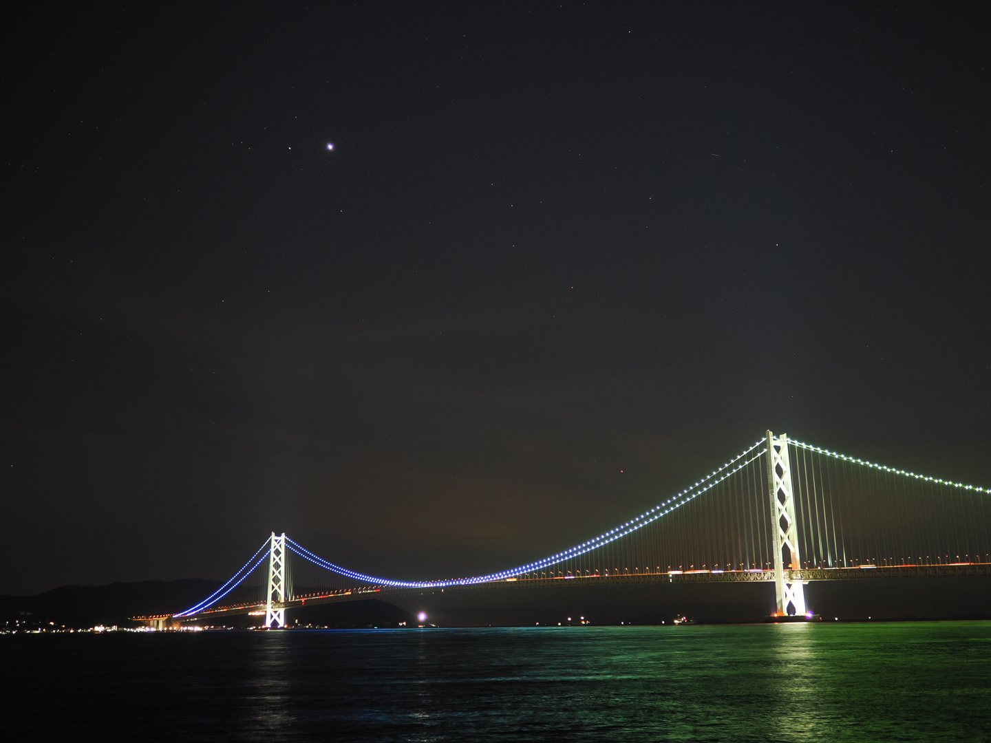 明石海峡大橋と星空を撮影。VividよりもCP3の方が夜空はしっかり暗く、橋のライトアップと星は鮮やかに表現できています。