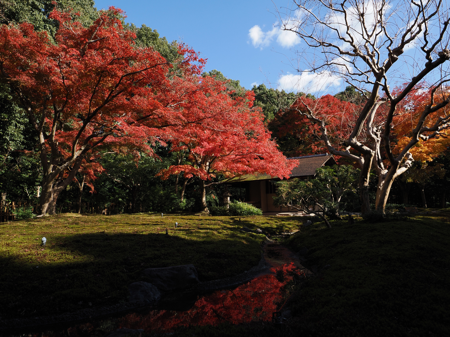 庭園内の小川に映り込んだ紅葉がとても綺麗でしたが、明暗差により日陰部分が真っ黒に。そこでライブGNDを用いたことで日陰部分の苔も綺麗に描写できました。