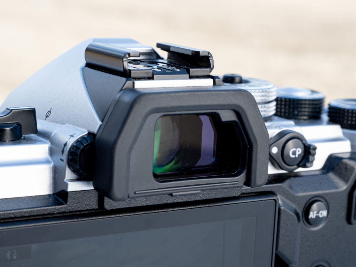 約236万ドット・視野率100%のOLEDビューファインダーを搭載。接眼すると背面モニターが消えてビューファインダーに切り替わるセンサーが設けられている。これらはOM-5に搭載されているものと同等だ。ファインダー部左側面には視度調整ダイヤルが設けられている。