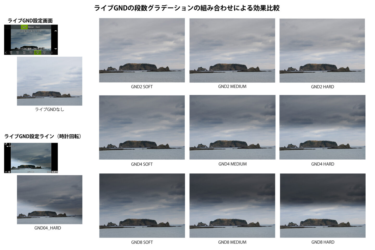 ライブGNDのグラデーションの強さの違いによる画像の変化を確認した。三段階のND度数(ND2,4,8)と三種類のグラデーションの強さ(SOFT,MEDIUM,HARD)をそれぞれ選択して組み合わせている。ND度数の変化による明るさの変化とグラデーションの強さの変化によるND濃度の変化がわかるだろう。