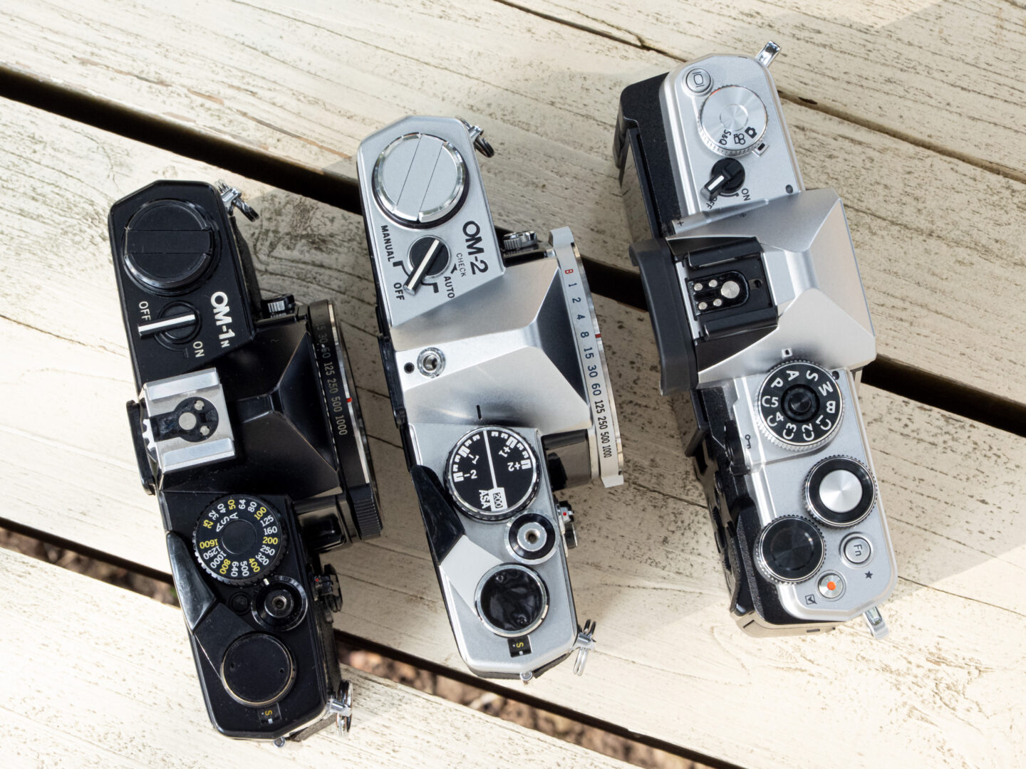 かくいう筆者も当時からOM-1(および改良型のOM-1N)を愛用している一人である。2000年代以降カメラがデジタル化され代を重ねてきた現在においても、時折OM-1を手にする度にいつかはこの形状・軽さのデジタル一眼カメラが世に出てきてくれはしないだろうかと願うほどには、『カメラ=OM-1スタイル』であるという思い入れを深く持ち続けてきた。おそらく(一定の世代以上の)多くのカメラ好きの人々も同じような思いを持っていたことだろう。そこに登場した「OM SYSTEM OM-3」なのだから、それはみんな気にならないはずがない。そこでここではOM-3と当時のフィルム一眼レフカメラ「オリンパスOM-1N、OM-2」を並べ見比べてみることにしよう。
