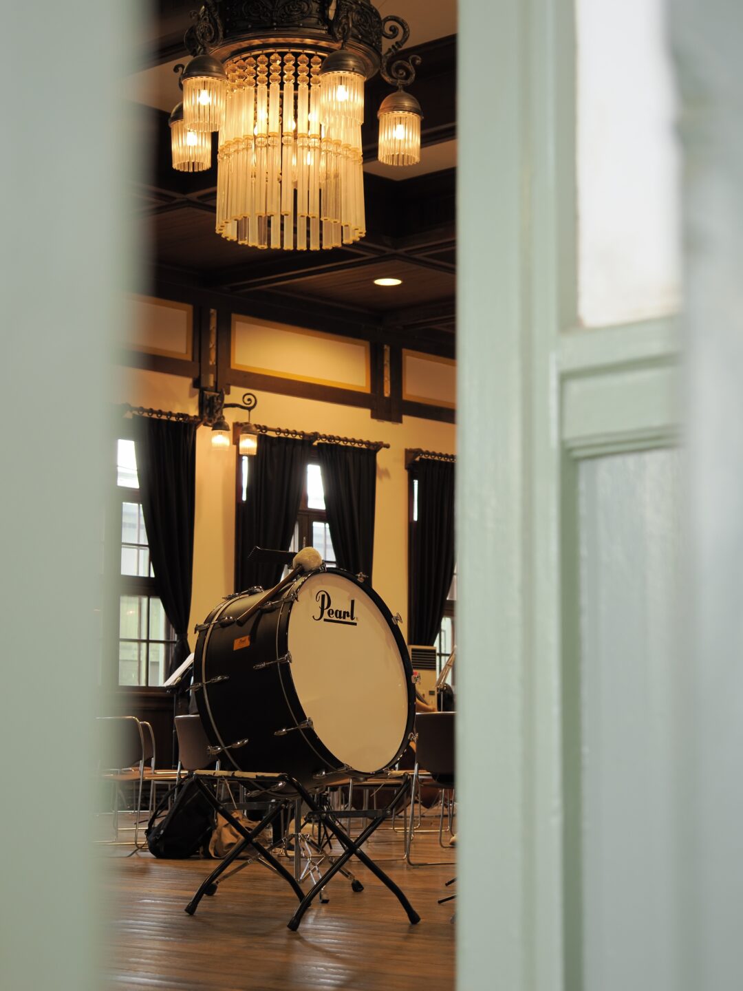 あがたの森公園を歩いていると、いたるところから音楽が聞こえてきます。ほんの少し開かれた扉から講堂をのぞくと、歴史を感じさせるシャンデリアや窓、空間に調和するバスドラム。「楽都」たる所以は、市民と音楽の距離の近さにあるのだな…と感じました。