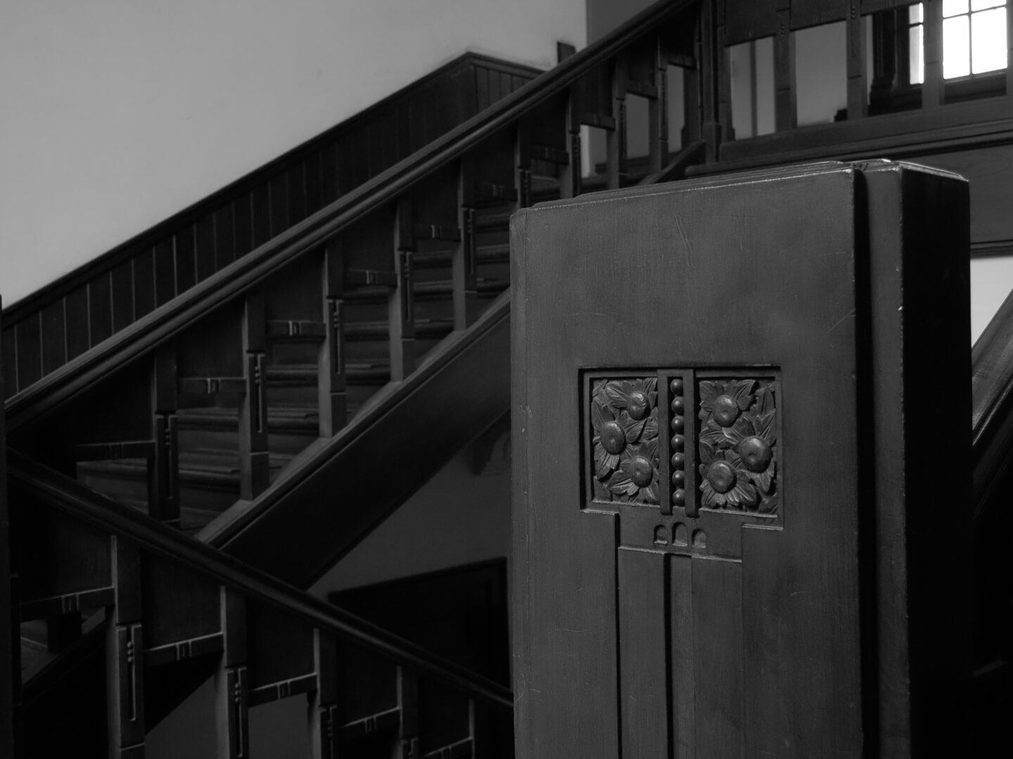 建物の中に足を踏み入れると、そこはもう大正時代。シンプルながらも大正ロマン漂う内装に心が踊ります。いつもはカラーで撮影することが多いのですが、モノクロで切り取ることで、時間の層がより鮮明に浮かび上がるように感じました。