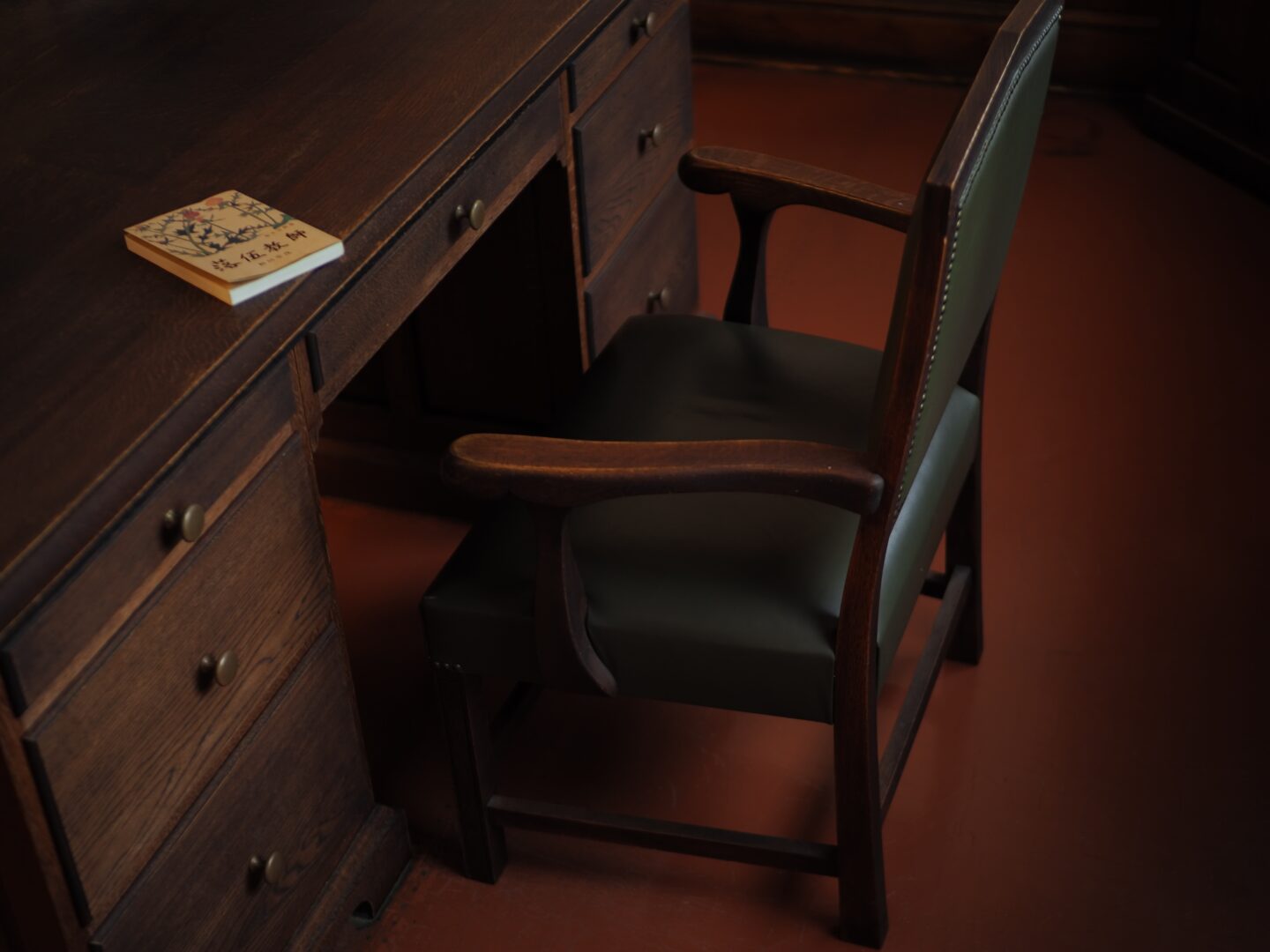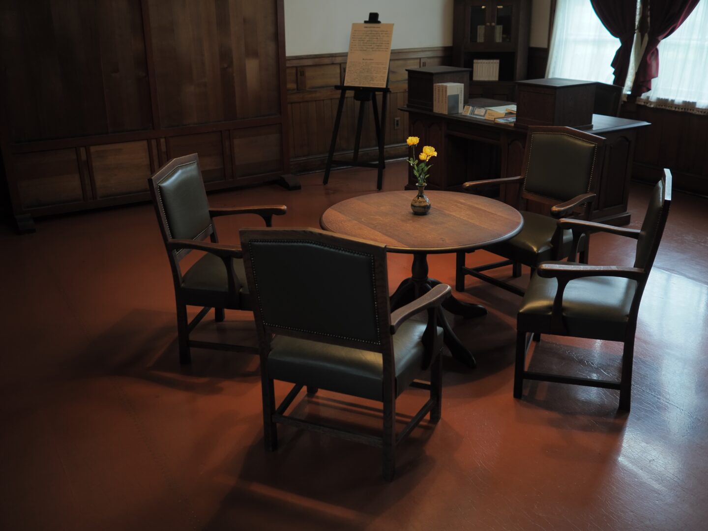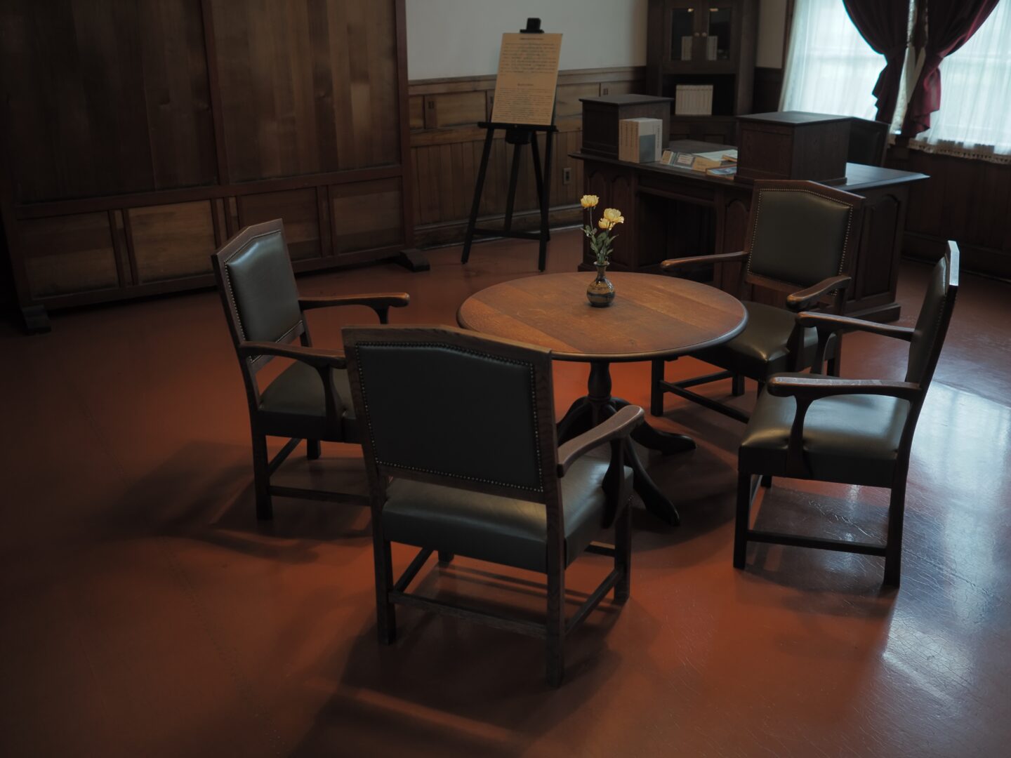 旧松本高等学校には、復元された教室がふたつあります。ひとつは普通教室、もうひとつはこちらの校長室。深い色合いのインテリアからは、威厳と歴史が静かに伝わってきます。