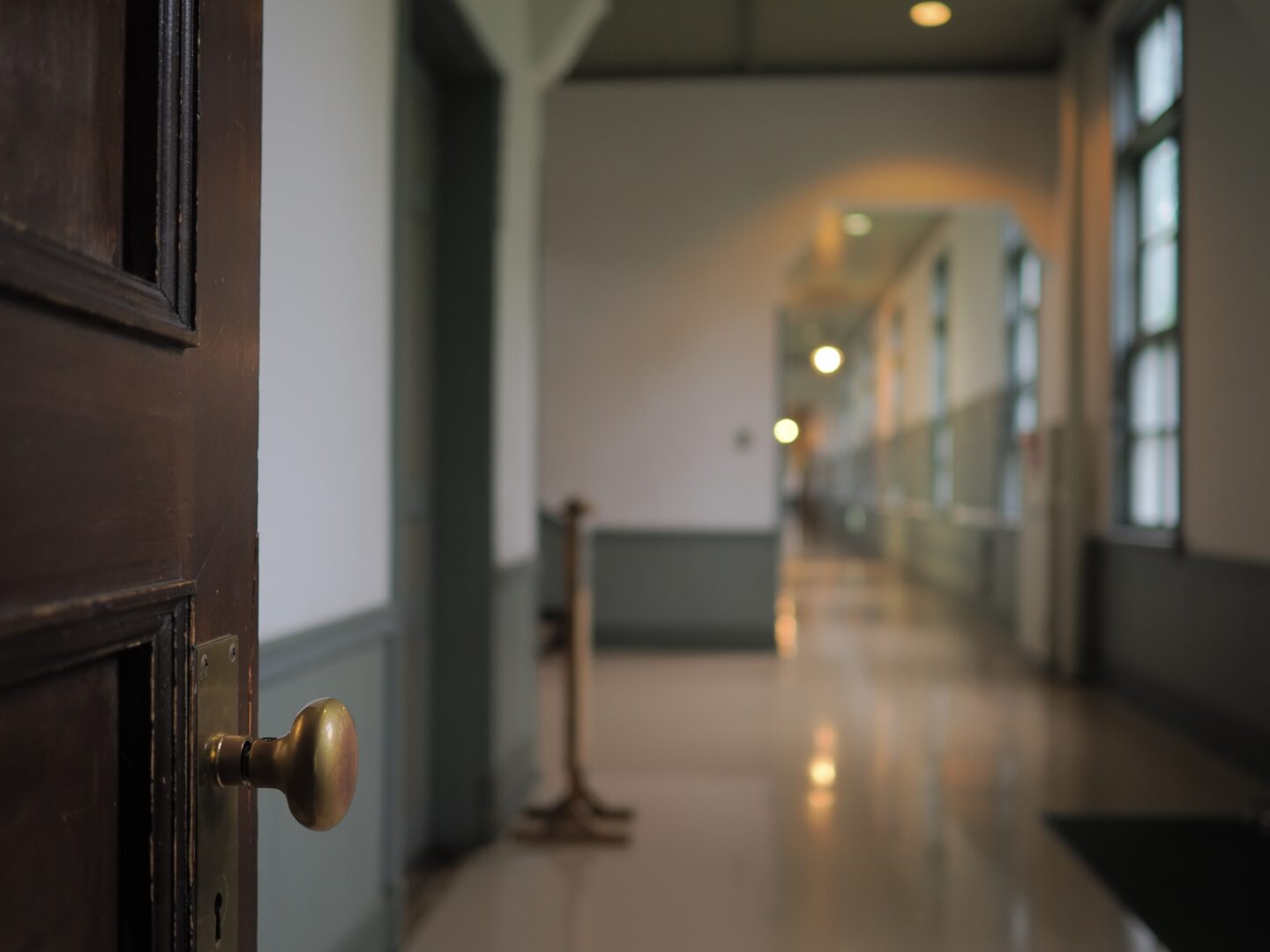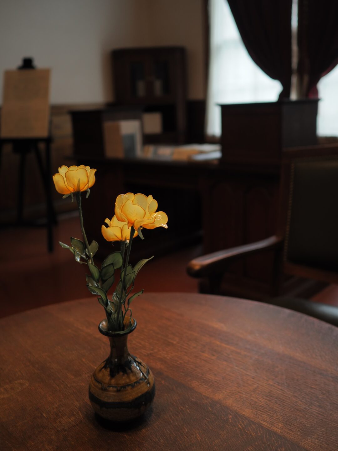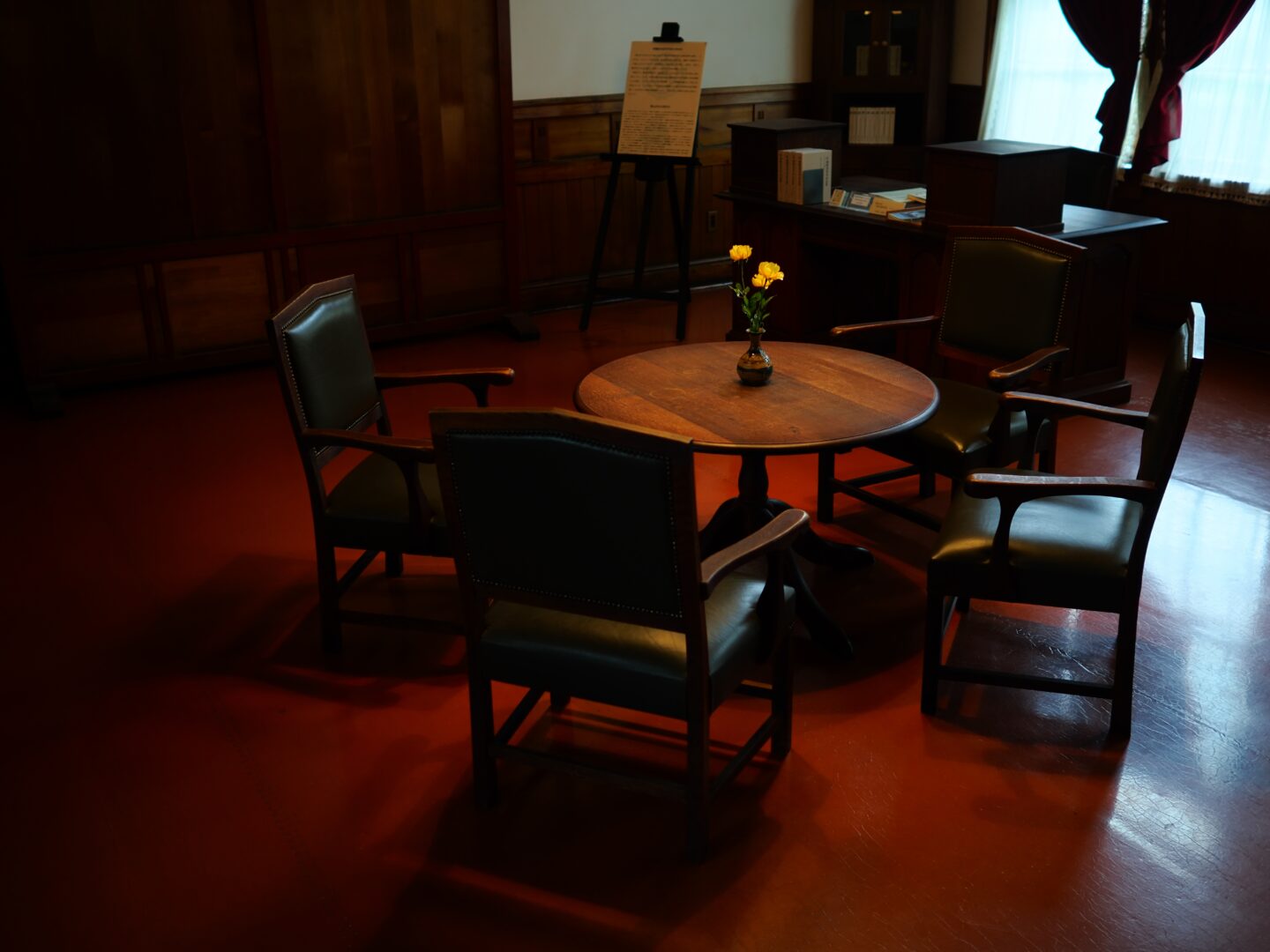 旧松本高等学校には、復元された教室がふたつあります。ひとつは普通教室、もうひとつはこちらの校長室。深い色合いのインテリアからは、威厳と歴史が静かに伝わってきます。