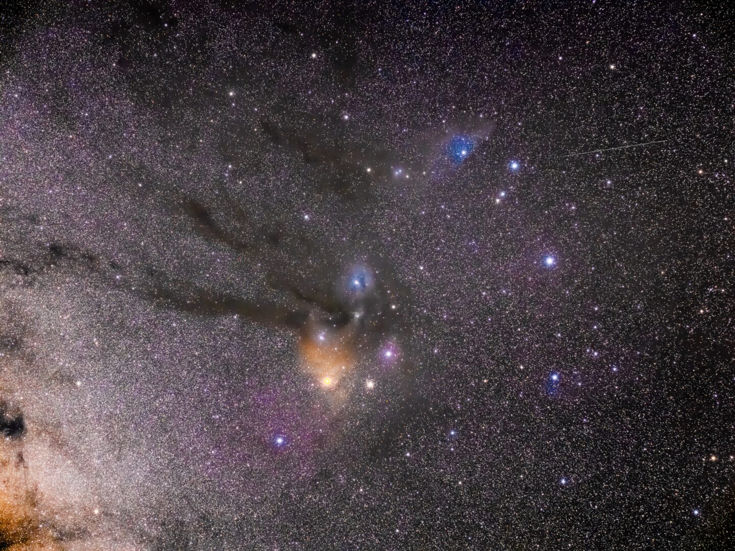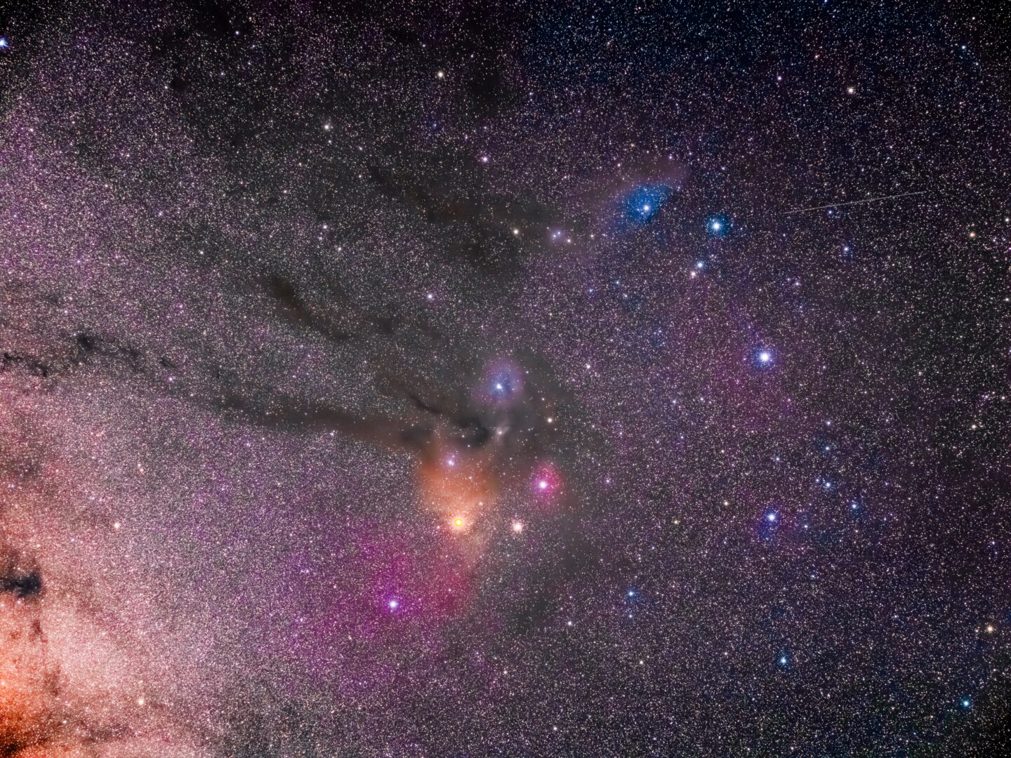 夏の星空を代表する「さそり座」の一等星アンタレス付近を撮ったのが次の写真だ。ここはカラフルな星雲が入り混じっていて、天体写真ファンにとても人気のあるエリアである。この2枚はノーマルOM-3とOM-3 ASTROの2台で全く同時に撮影し、背景の色がほぼ同じになるように画像調整している。
