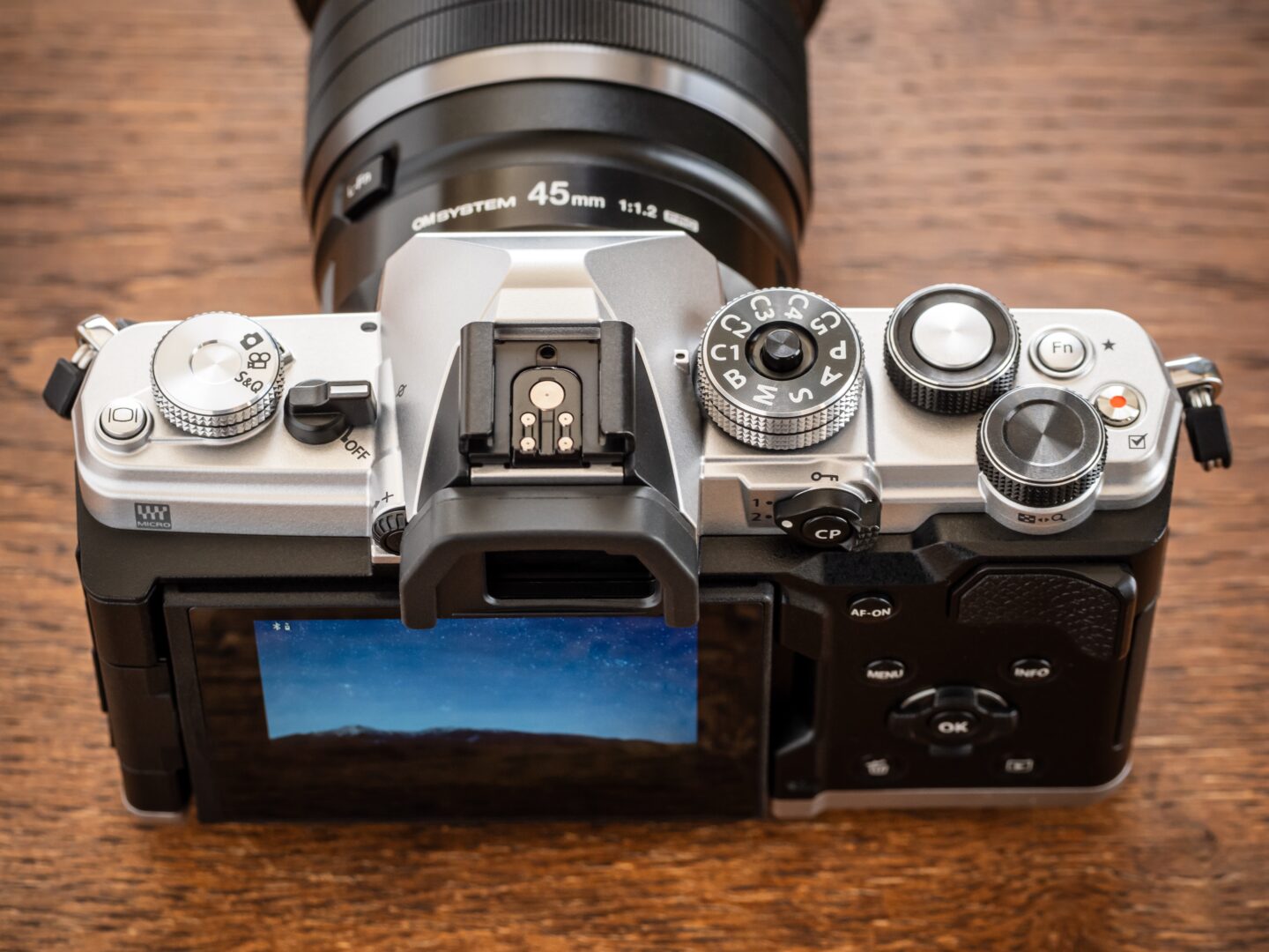 OM-3 ASTROボディ。背面の「AF-ON」ボタンを押すと星空AFが作動する。左肩の「|⚪︎|」ボタンにナイトビューと通常表示の切り替え、右肩の「Fn」ボタンに拡大表示がセットされていて、MFしたい場合にも速やかにモニター表示を切り替えることができる。同じく右肩の動画ボタン「◎」がフォーカスリングロック機能に割り当てられている。