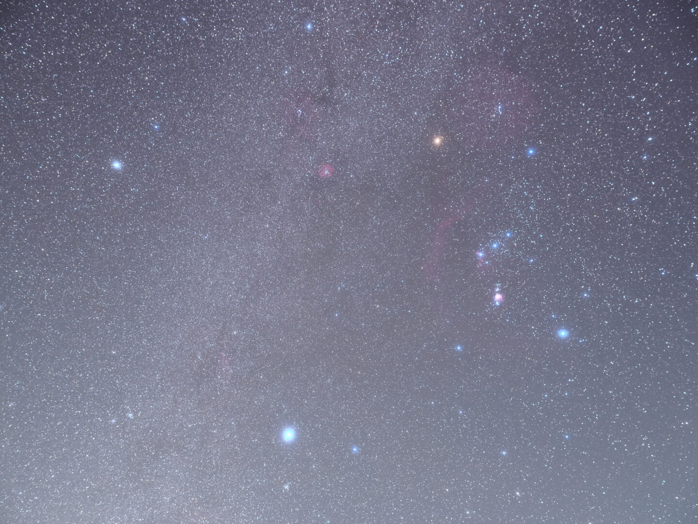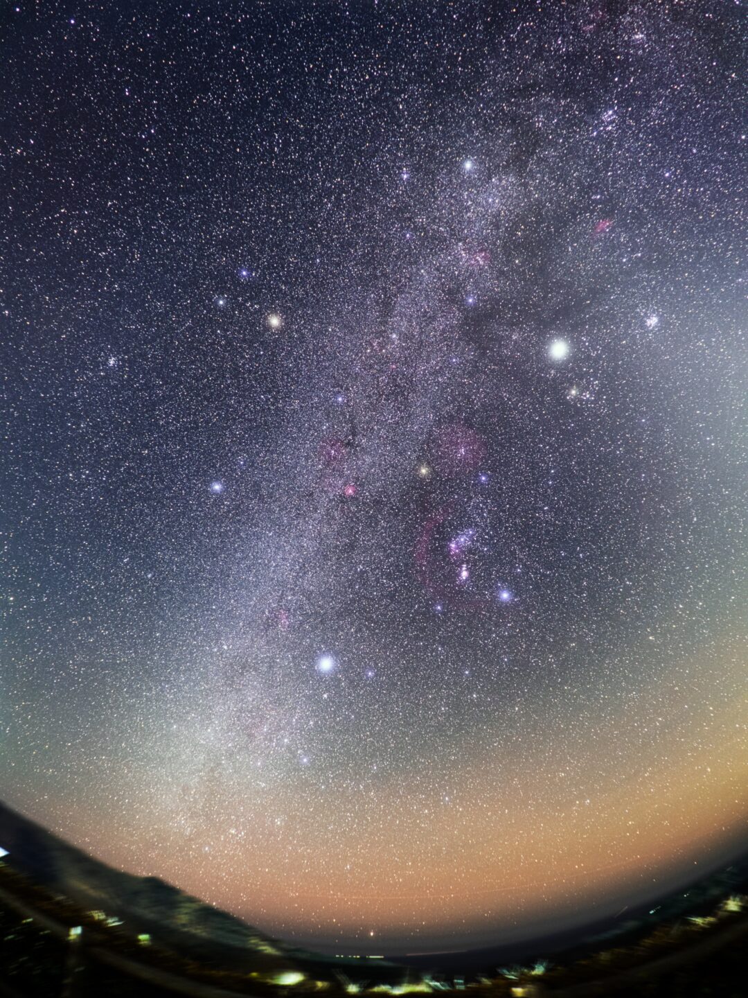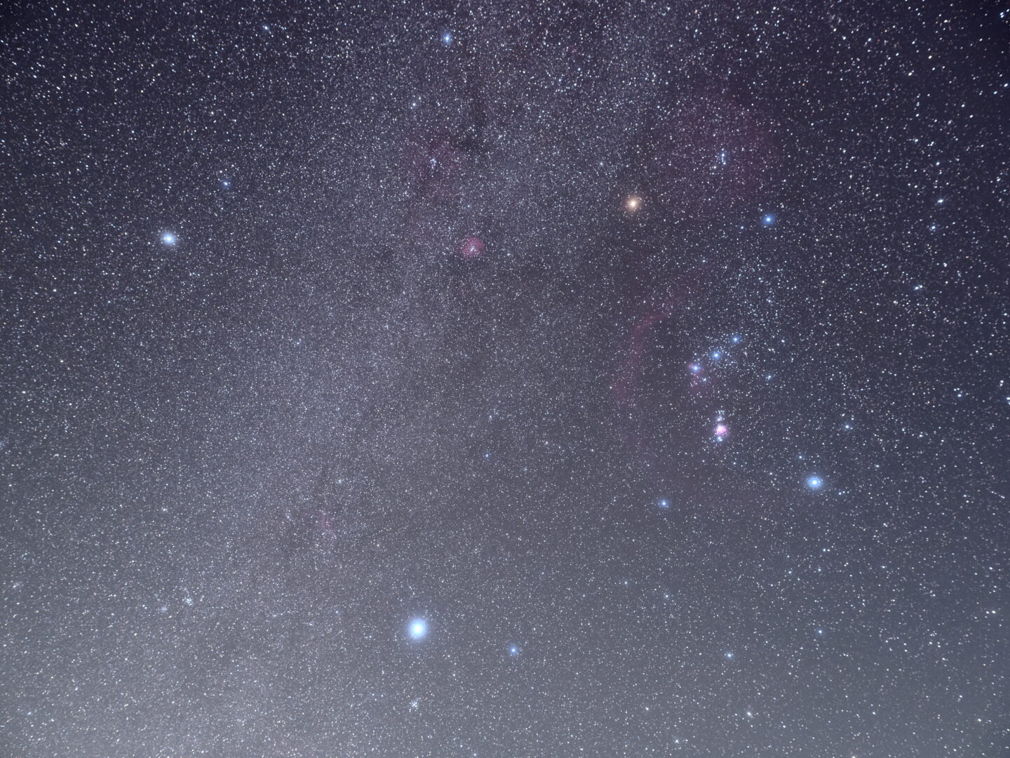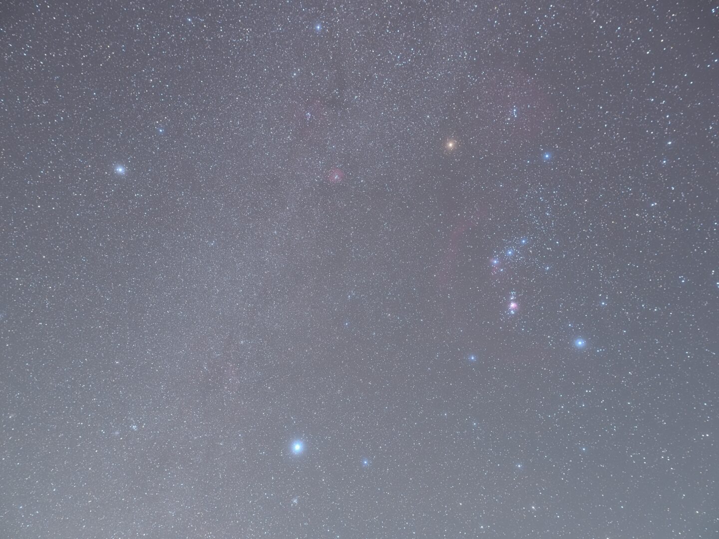焦点距離の短い魚眼レンズなので、赤道儀の追尾エラーはまず問題にならない。それでこの写真は三脚ハイレゾショットで撮影した。こうして見ると、淡い冬の天の川もなかなか太いことがわかる。低空の空が赤っぽいのは「大気光」だ。真南の水平線には一等星のカノープスが見えている。