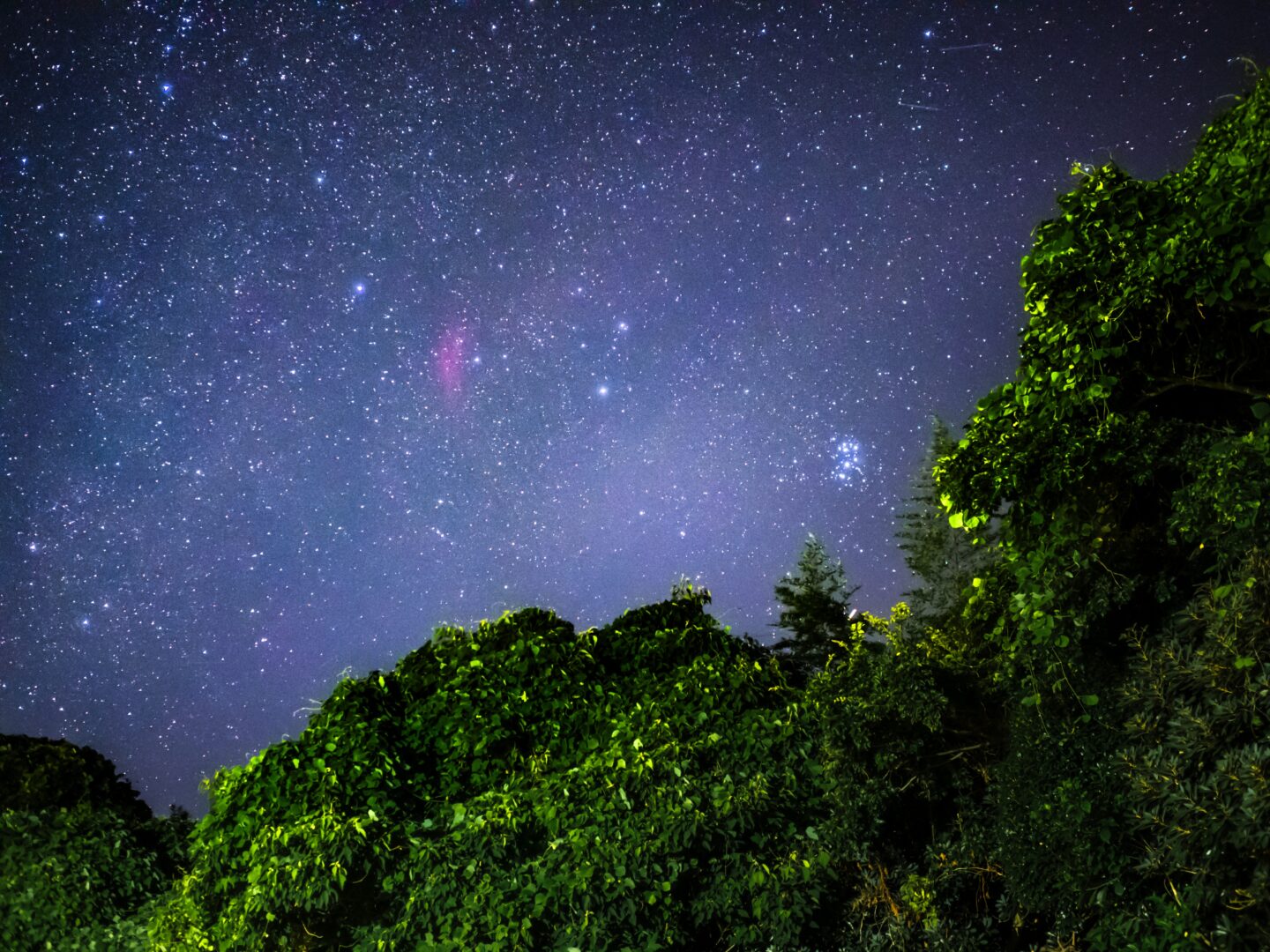 遠くの照明で照らされているクズの茂み。その向こう側に「すばる」とカリフォルニア星雲が昇ってきたところを手持ちで撮影した。クズの緑と星雲の赤が印象的になるようにRAW現像して仕上げてみた。
