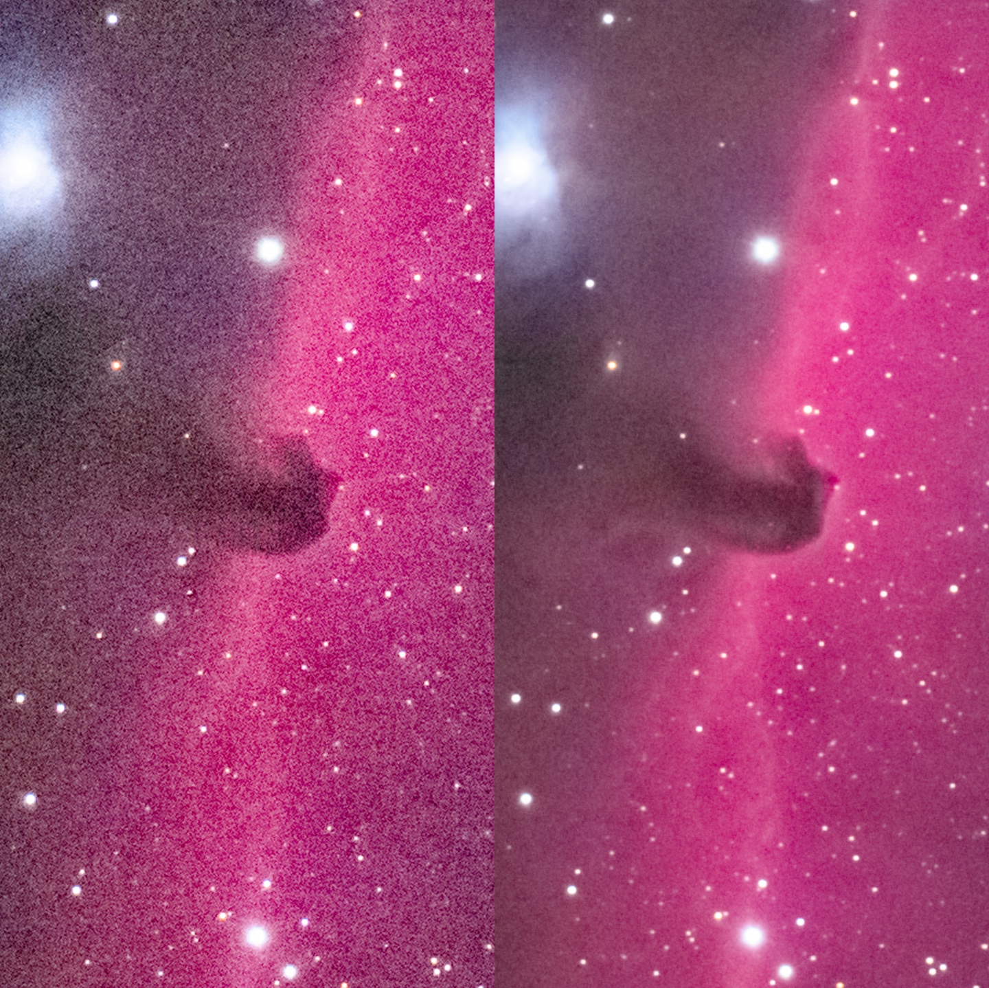 左がシングルショット、右が12枚スタックされた手持ちハイレゾショット。馬頭星雲の部分をハイレゾショット等倍に合わせて切り出し並べてみた。強力な画像処理でノイズが目立ってしまうのが星雲の写真だが、ハイレゾショットの方はもちろんはるかに低ノイズ。シングルショットだとノイズに埋もれてしまうような小さな星まで、ハイレゾショットでハッキリと写し出せていることもよくわかるだろう。