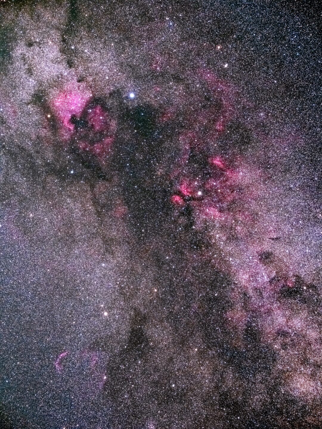 次の写真は、このようにして撮影した天の川だ。天の川に散在する赤い星雲たち、入り乱れる暗黒星雲、さらには非常に暗い星まで、赤道儀を使わずにここまで写せるのは驚異的だ。
