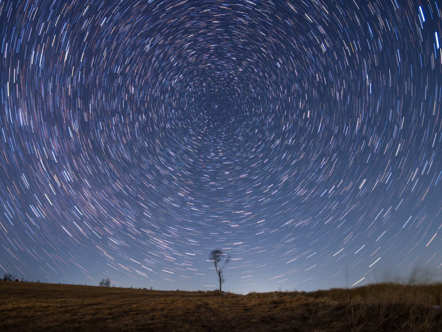 草原に立つ一本木の真上に北極星。撮影時はものすごい強風でカメラが飛ばされそうなほどだった。それで三脚の足を大きく開き、地面に近い低さでカメラをセットして撮影した。