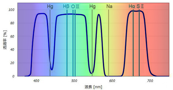 「BMF-LPC01」は、外灯によく使われる水銀灯やナトリウム灯の輝線スペクトルを効果的にカットするが、星雲の光はしっかり通すように作られている。グラフのHgが水銀灯の放つ輝線、Naがナトリウム灯の輝線だ。