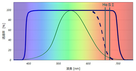 次のグラフを見てほしい。濃い青の実線が天体用にフィルターを換装したOM-3 ASTROの分光感度を模式的に表したものだ。破線が通常モデルの赤外線カットで、このように赤外線に近い赤い光を大きくカットしている。こうして人の目の色の感じ方(緑の山形の実線)にカメラの色の感じ方を合わせているわけだが、そのために散光星雲に見られる赤い光のHα線(水素原子が放つ波長656.3nmのスペクトル線)の波長で大幅に感度が低下していることが分かる。