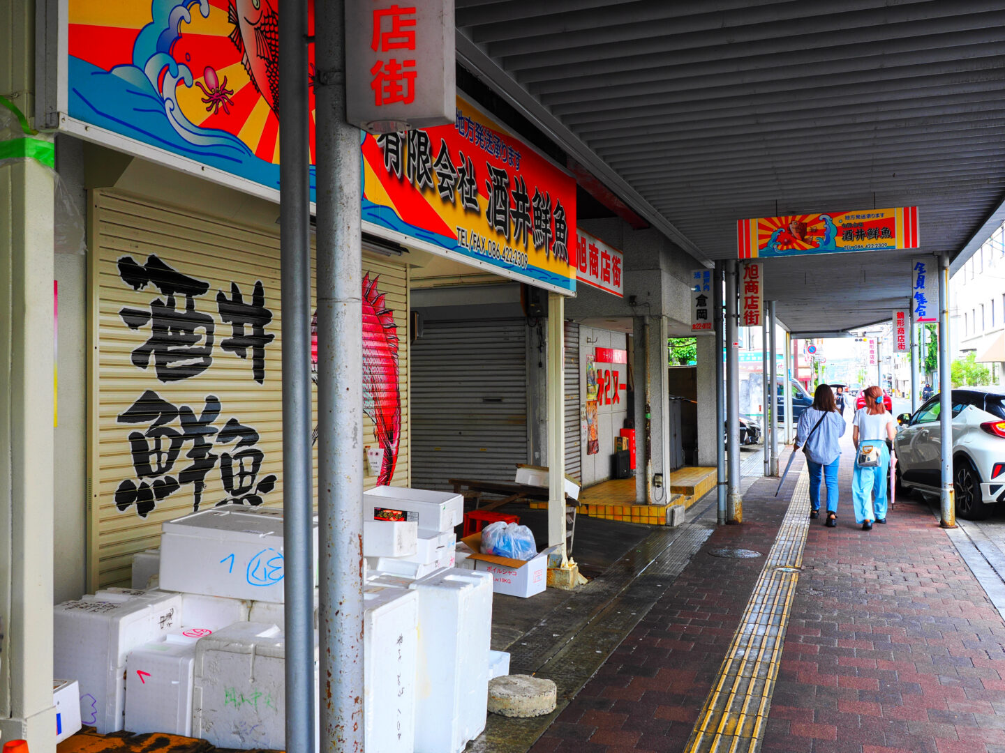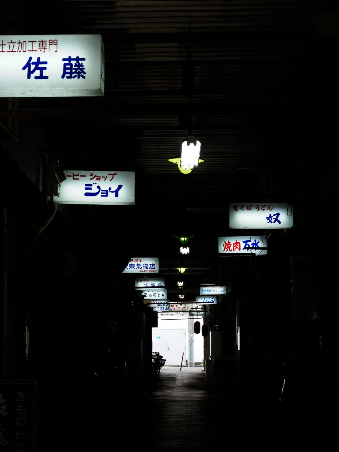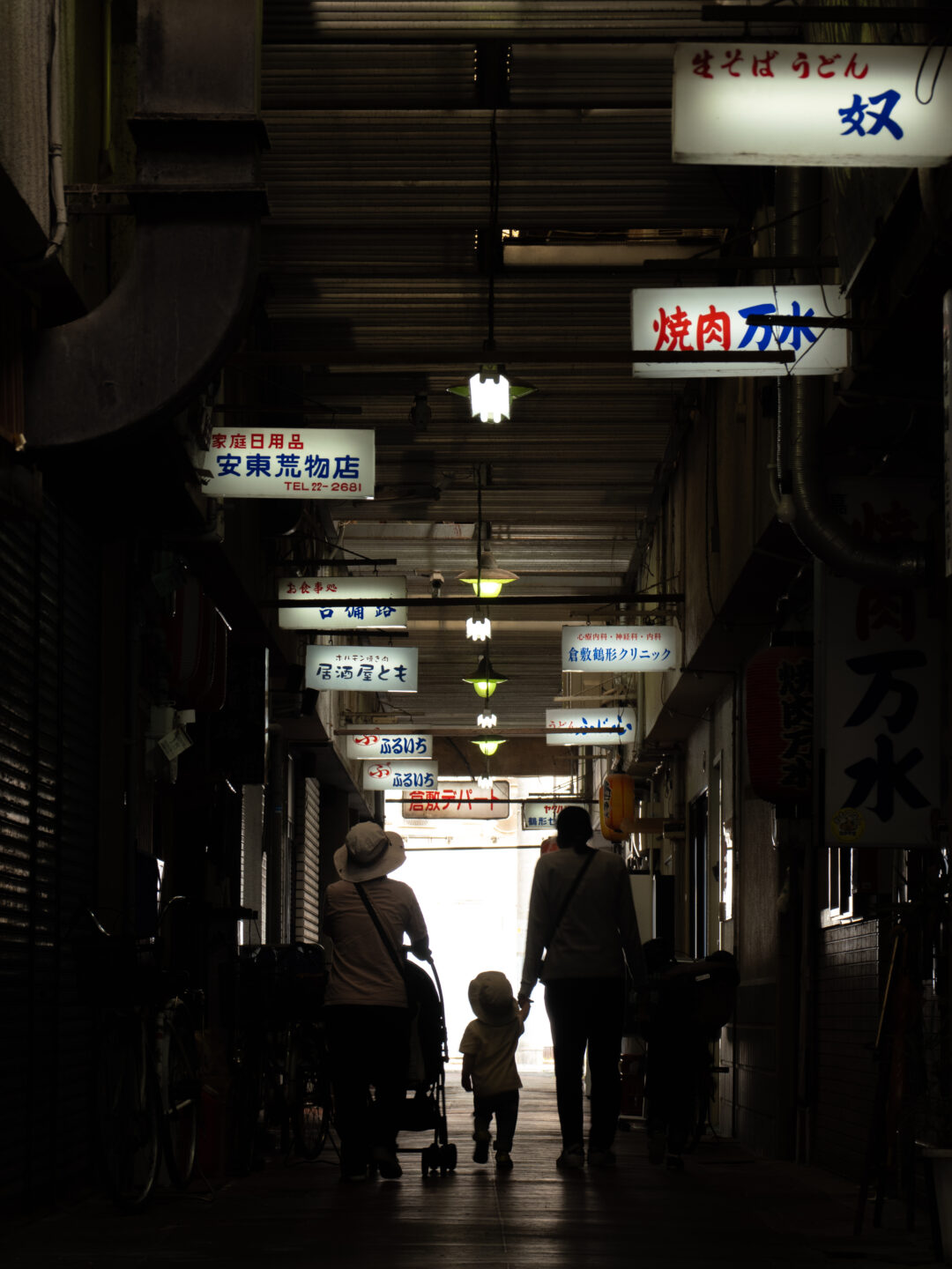 戦後にできた倉敷最古の商店街を散策。こちらはファーストショット。レトロな電光看板を入れて縦位置で奥行きを出しましたが、通路に誰もいないので物語性が感じられない作品に。