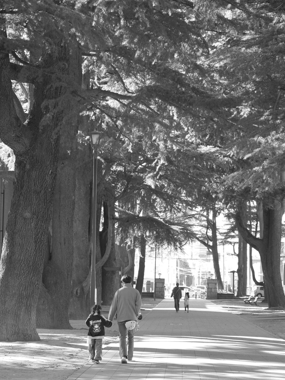 手を繋ぐ親子の姿が微笑ましい一枚ですね。モノクロプロファイルコントロールの粒状フィルム効果により、過去の幸せな記憶のようにも感じられます。路面に差し込む日差しが親子の歩く位置と重なり、温かみが増すだけでなく、輪郭が照らし出されることで存在感も増していますね。モノクロ撮影で色の情報が削除されたことにより他の色に目移りすることなく、親子へと自然に目線が誘導されます。縦位置で切り取られたことで、並木道の奥行きとヒマラヤ杉の高さを強調できているのも良いと感じました。