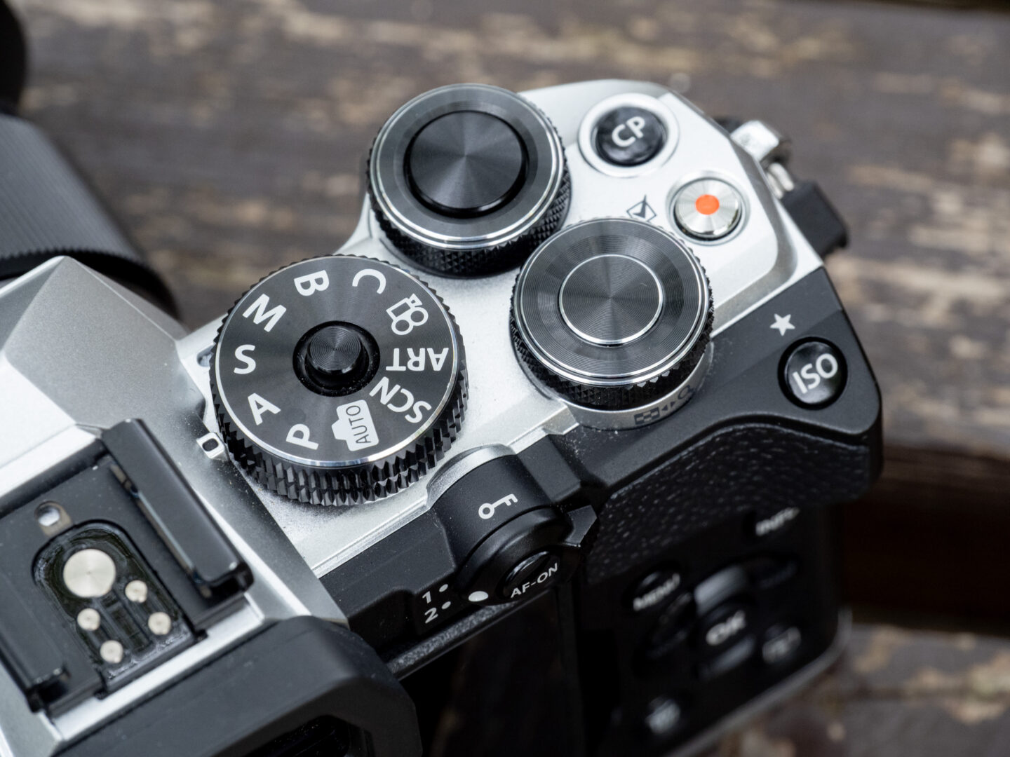 カメラ上面右手側。ダイヤルおよびシャッターボタンが絶妙な位置関係となっており、OM-1 Mark IIなど大きなカメラのレイアウトに慣れた筆者でもまったく違和感なく操作できる。ただ今回新設されたCPボタンや親指付け根の位置に設けられたISOボタンは、筆者の場合はカメラをグリップしたままだと近すぎて指が曲がらないので少々押すのに難儀してしまった。