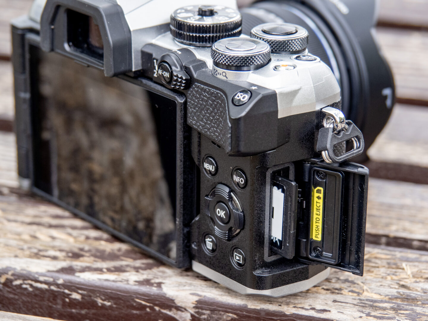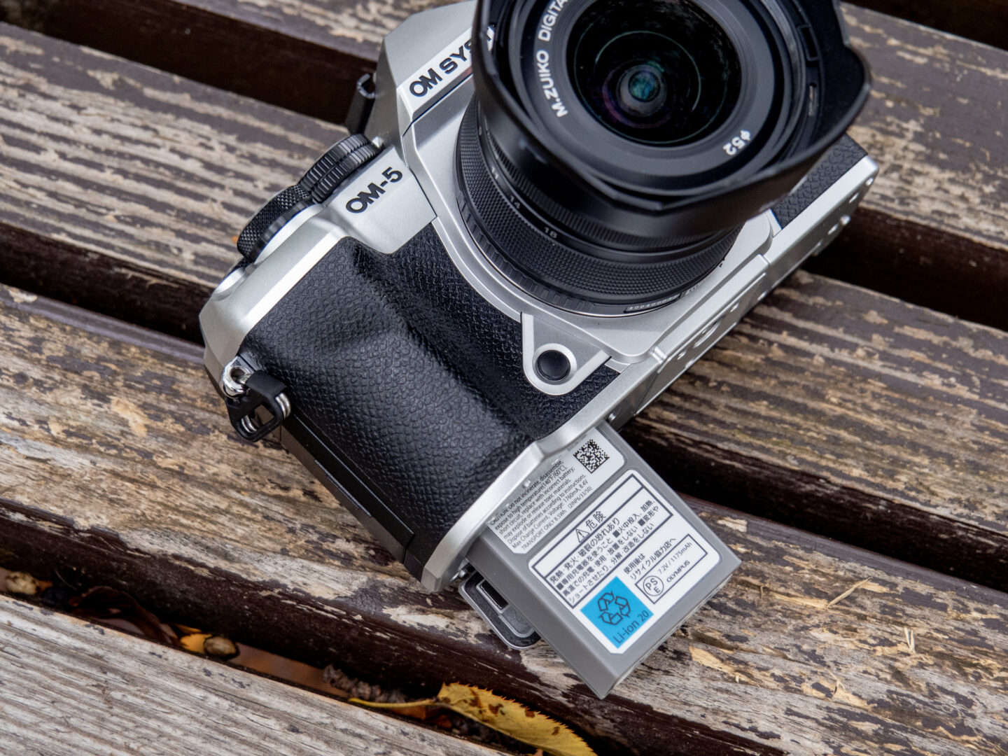 バッテリー室は底部にあり充電池はOM-5と共通のリチウムイオン充電式バッテリーBLS-50を採用。BLS-50はE-M5 Mark III、E-M10 Mark IVなどでも採用されている充電池でもあるので、これらの機種のユーザーであれば充電池の流用が可能だ。