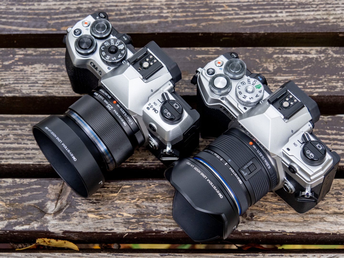 OM-5 Mark II(左)とOM-5(右)を並べて比較する。カメラの大きさ、全体の形状の印象はとてもよく似通っているが、OM-5ではカメラトップカバーの形状が段差のあるデザインであったものがOM-5 Mark IIでは窪みのない滑らかな形状となっている点が大きな違いだ。これはアウトドアでの撮影時に発生する砂埃や水滴などが付着した場合でも、容易に拭うことができるようにしたものと思われる。