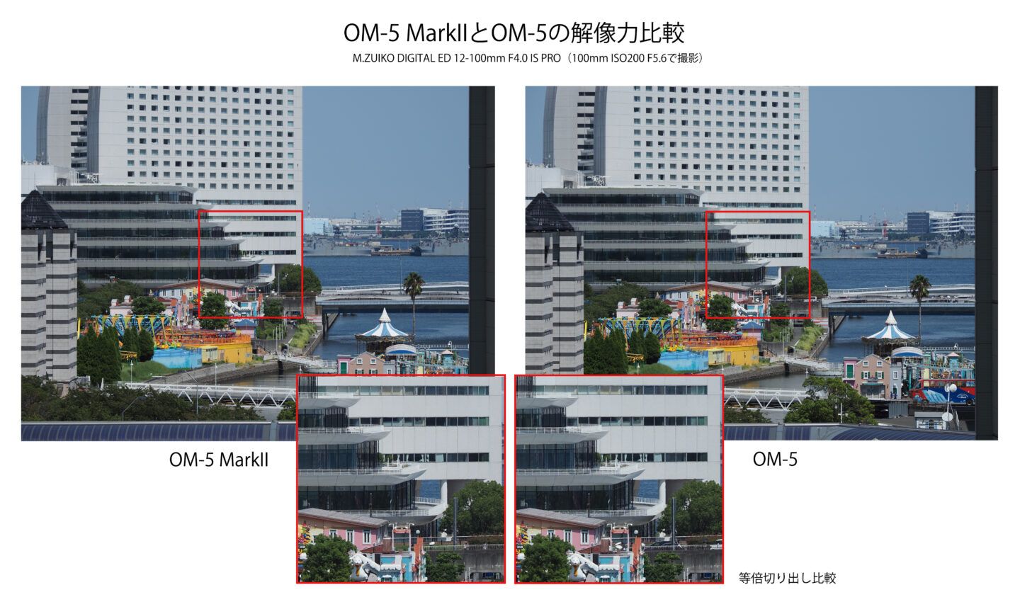 OM-5 Mark IIおよびOM-5のイメージセンサーは共に有効画素数約2037万画素4/3型Live MOS センサーを採用しており、画像エンジンも同じTruePic IXである。実際にピクセル等倍に拡大した撮影画像を見比べても、いずれも同等の解像感となっていることから両機に解像力の点において差異はないと判断してよいだろう。