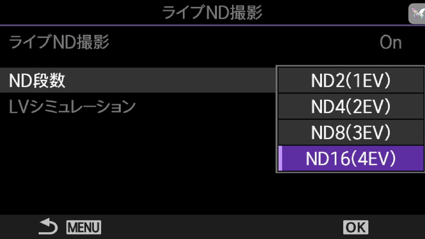 ライブNDはカメラへ取り込む光量を減衰させるNDフィルター同様の表現効果をデジタル処理にて擬似的に得られるものだ。OM-5 Mark IIではND2(-1EV)から1EV間隔でND16(-4EV)まで選択が可能。シャッター優先モード、マニュアルモードで使用可能となる。