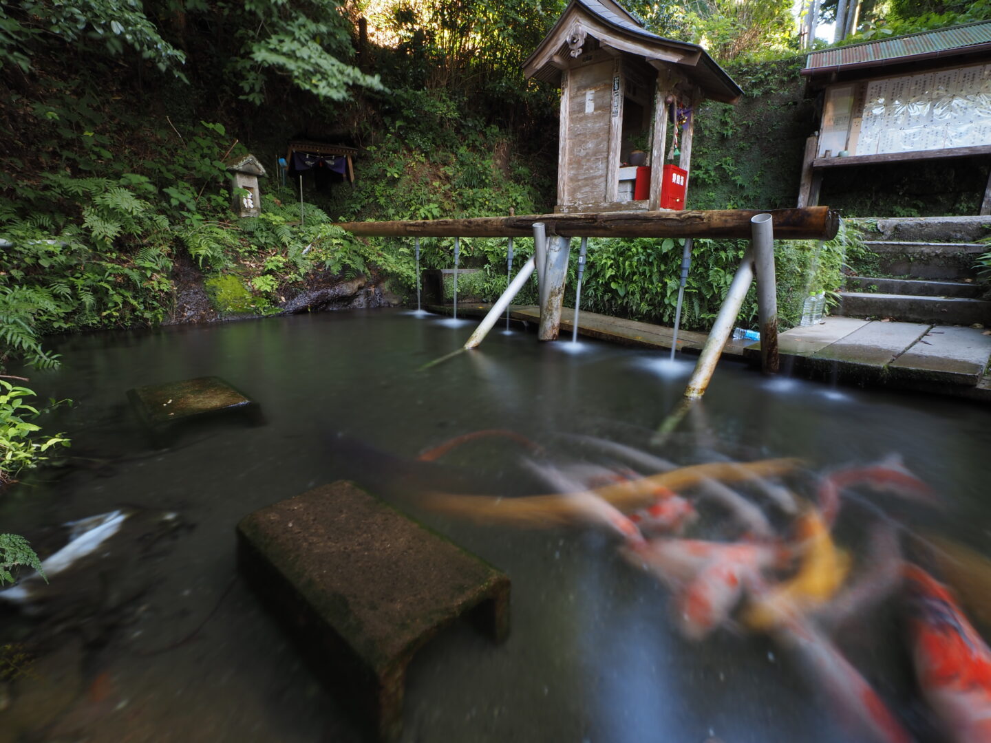 清らかな湧水溜まる池の様子を、ライブND16を使用して10秒のスローシャッタースピードで撮影した。湧水が池に白糸のように落ちる様子や池の中を泳ぐ鯉たちが流れるように写っている。通常肉眼では見ることができない時間の流れを、スローシャッター撮影で可視化できるところがNDフィルター効果の面白いところだ。