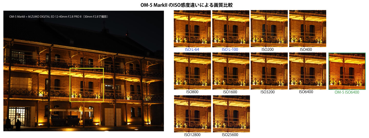 OM-5 Mark II にてISO感度を拡張低感度域の下限64から標準感度、そして拡張感度域上限25600まで1EVごとに変えながら撮影した。画像の一部を等倍で切り出し比較する。注目点は建物壁面のノイズとディテールの精細さとする。