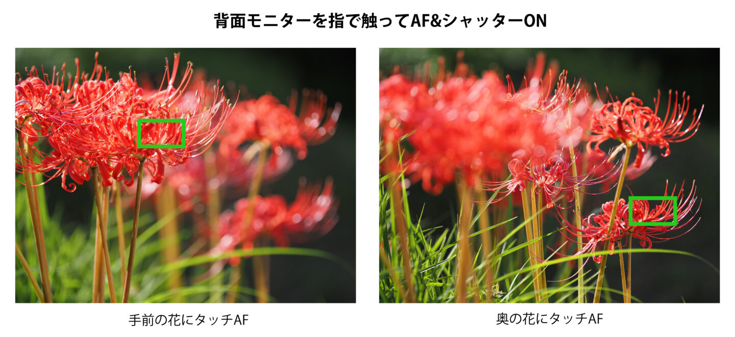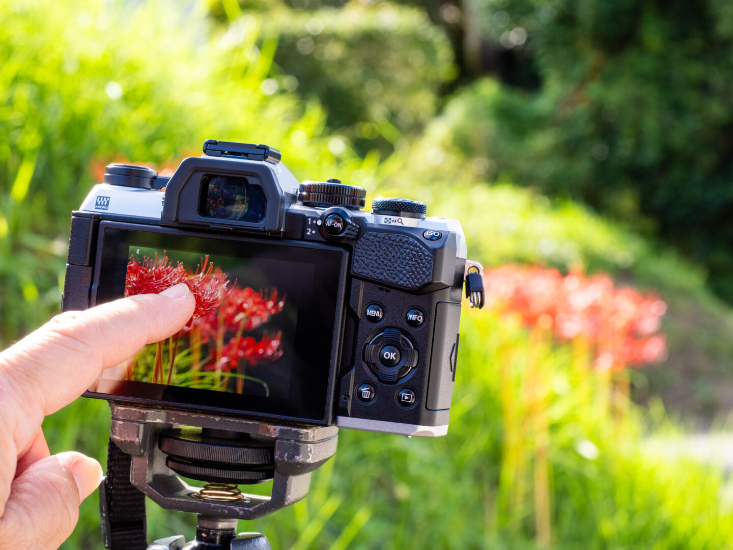 ライブビュー画面を見ながらじっくりと撮影するときには、背面モニターを直接指先でタッチする「タッチAF」「タッチAF+シャッター」がおすすめ。ここでは道端に並んで咲く彼岸花を複数本手前から奥まで構図に入れて撮影。その際に手前の花をタッチしてピントを合わせて背景をぼかすのか、奥の花をタッチしピントを合わせることで前の花をぼかすか、いずれを選択しようかと考えながら撮影している。