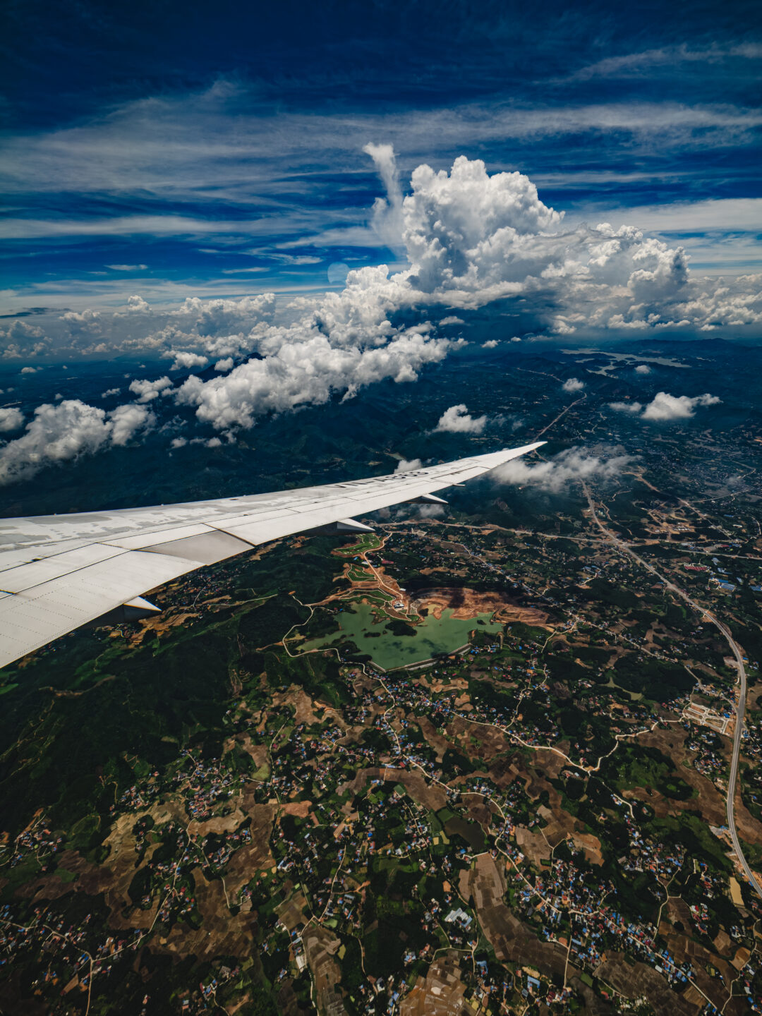 関西国際空港からノイバイ国際空港へ。トランジット先のベトナムの街並みを飛行機の機窓から撮影。長いフライトになるので窓側の座席がおすすめ。