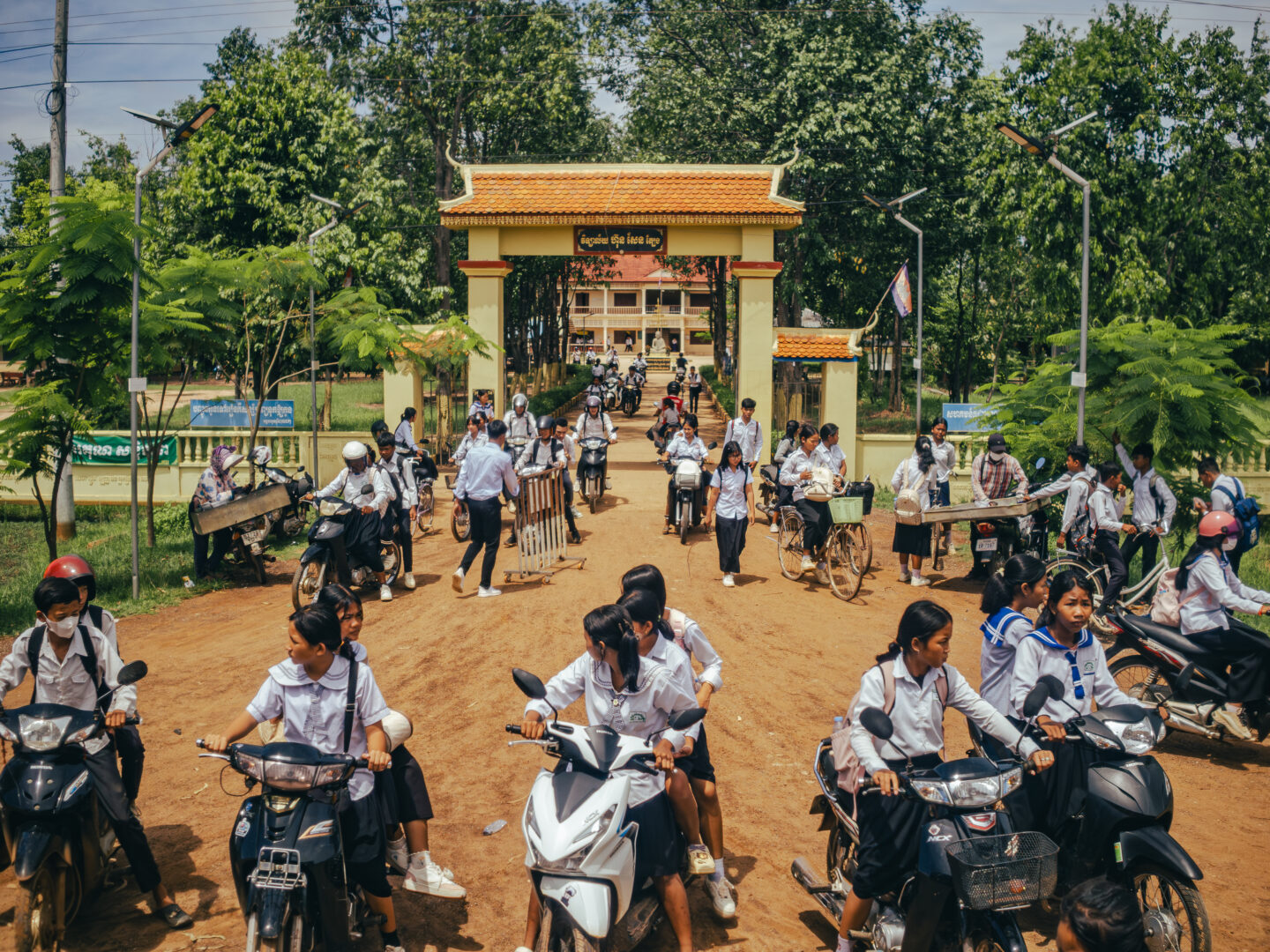 日本ではありえない景色…!ノーヘルも当たり前の状況です。多分ここは高校だと思うのですが、ちょうどバスが横を通ったタイミングで通学している学生たちが門の前に出てきました。二輪の3人乗りは流石に日本では見ることがないですね…笑
