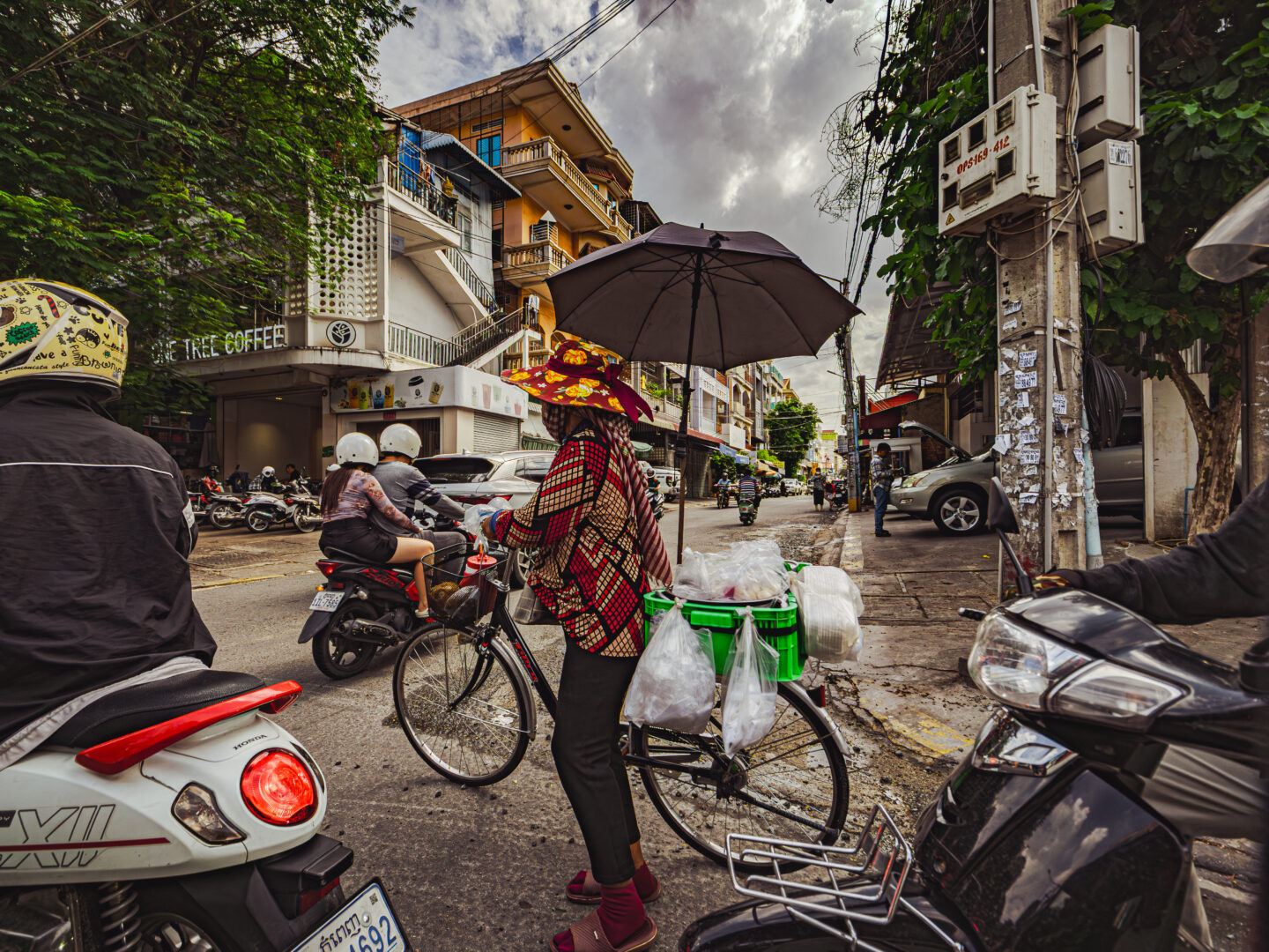 プノンペンに到着したら次はカンポット行きのミニバスに乗り換えなのですが、乗り場まで少し距離があるのでトゥクトゥクを利用します。カンボジアはトゥクトゥクがあちらこちらに走っていますし、送迎用の専用のスマホアプリもあります。窓がないので移動しながらのスナップを楽しみやすいですが、トゥクトゥクからカメラやスマホを出して撮影していると通り過ぎの原付のスリに遭うこともあるとか。なので撮影する時はあくまで車内から。