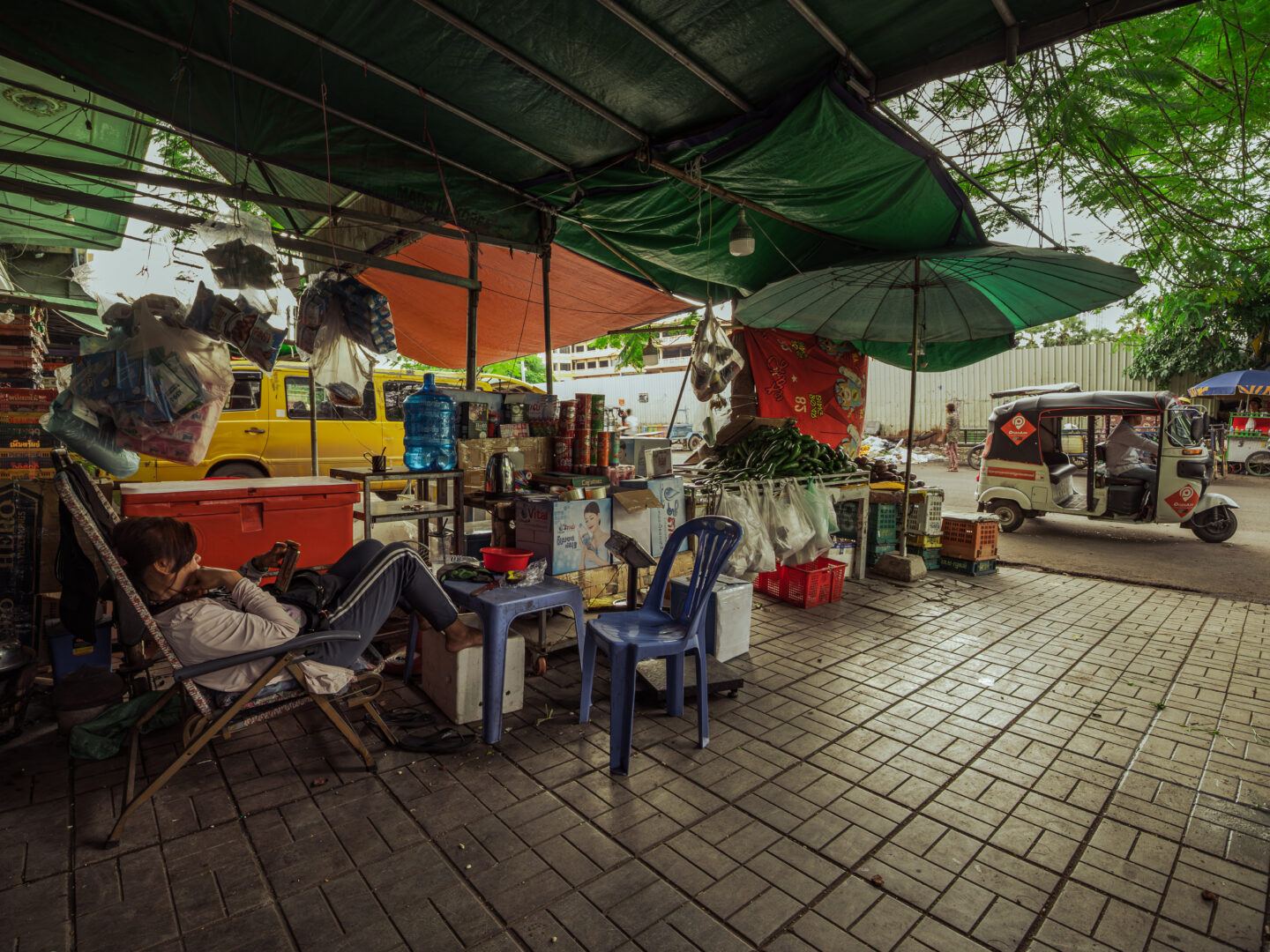 ミニバスのチケット売り場に到着。これはチケット売り場の隣の露店ですが商売っ気はありません。カンボジアの人は基本的にのんびりと過ごしている印象です。お店の人も寝てるかスマホで動画を見ています。